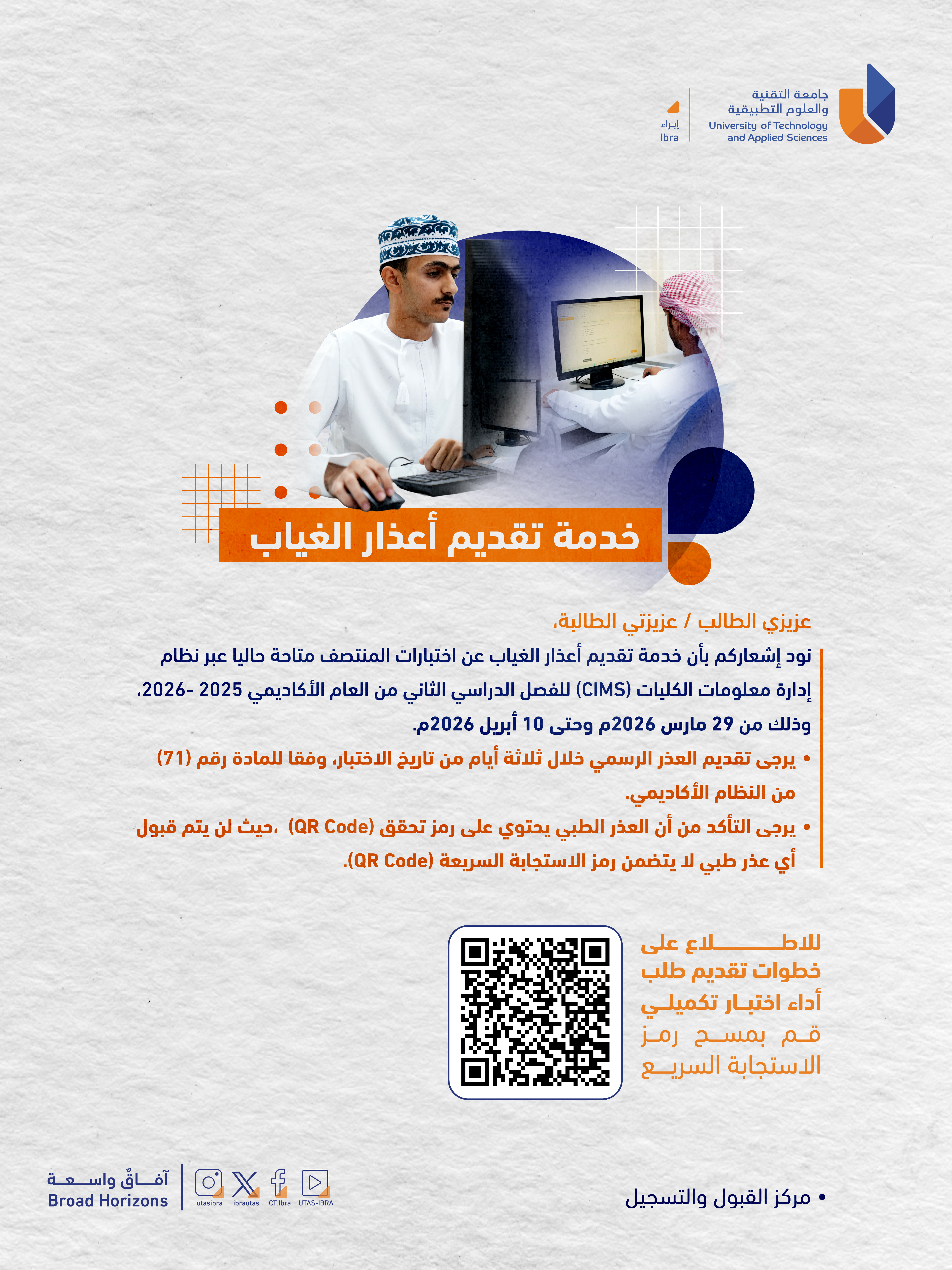 Tuesday, March 31, 2026 / Categories: Announcements خدمة تقديم أعذار الغياب Previous Article Mid Term Examinations final version semester 2 2025-2026 Print 10 Rate this article: No rating