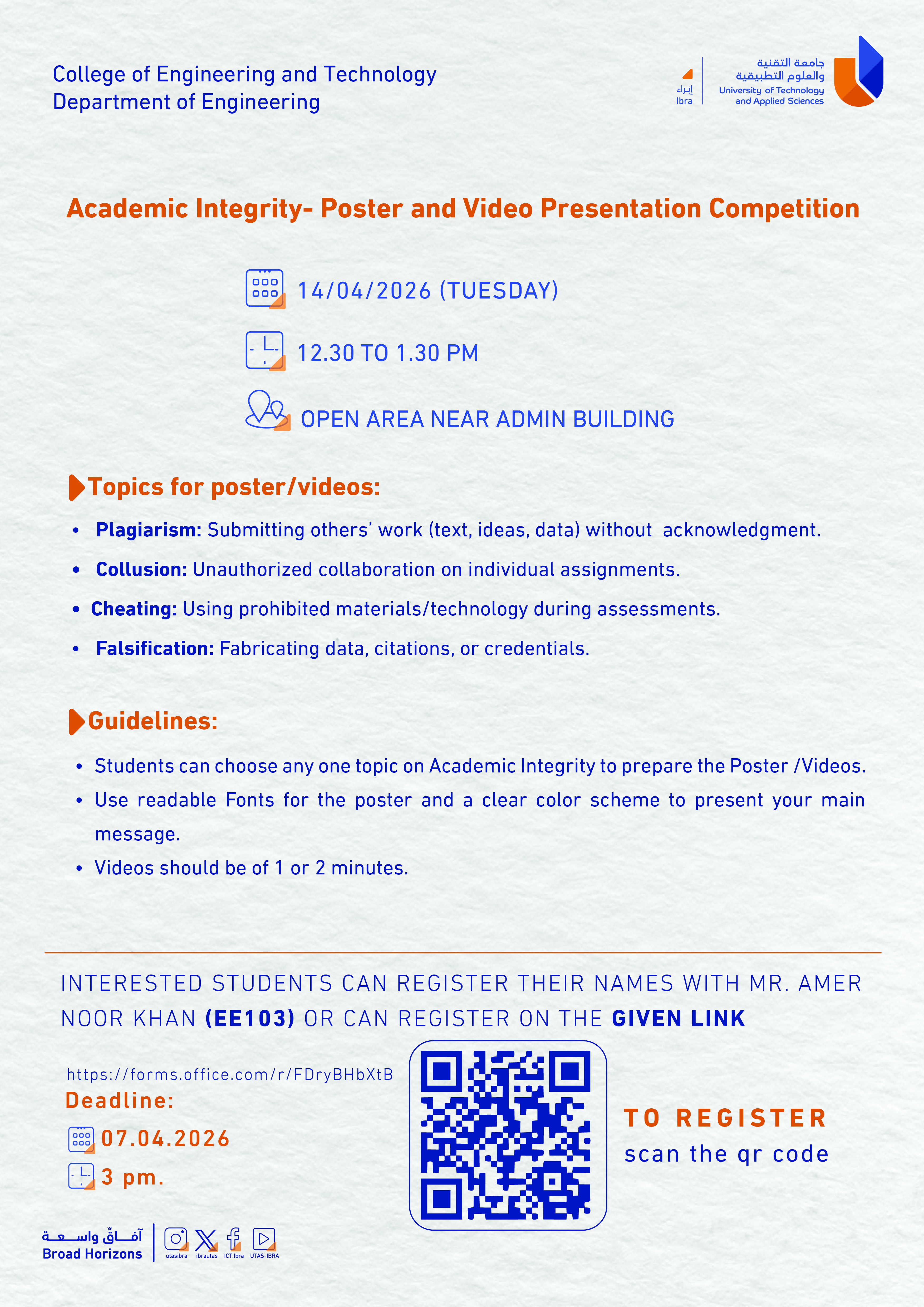 Thursday, April 2, 2026 / Categories: Announcements, Engineering Academic Integrity- Poster and Video Presentation Competition College of Engineering and Technology Previous Article خدمة تقديم أعذار الغياب Print 6 Rate this article: No rating