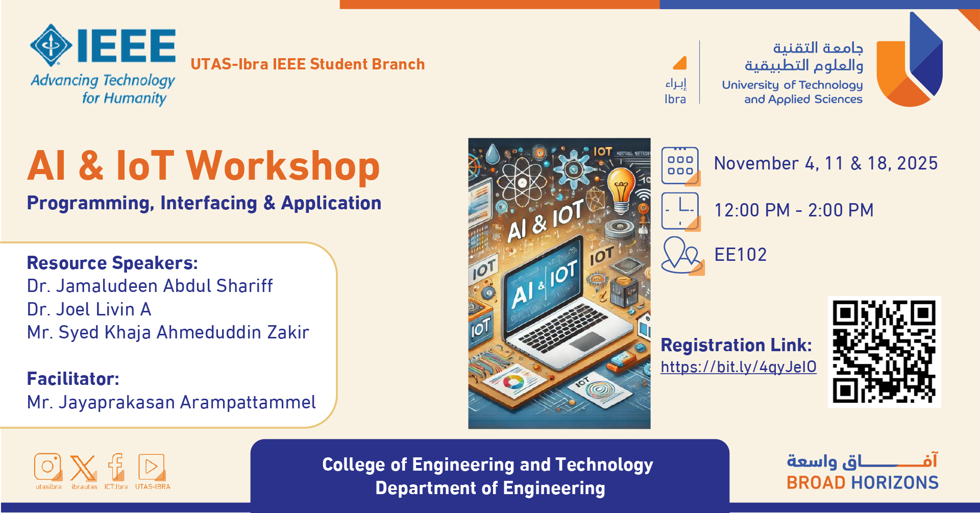 Thursday, October 30, 2025 / Categories: Announcements Al & loT Workshop Programming, Interfacing & Application College of Engineering and Technology Department of Engineering Previous Article Al & loT Workshop Programming, Interfacing & Application Print 13 Rate this article: No rating