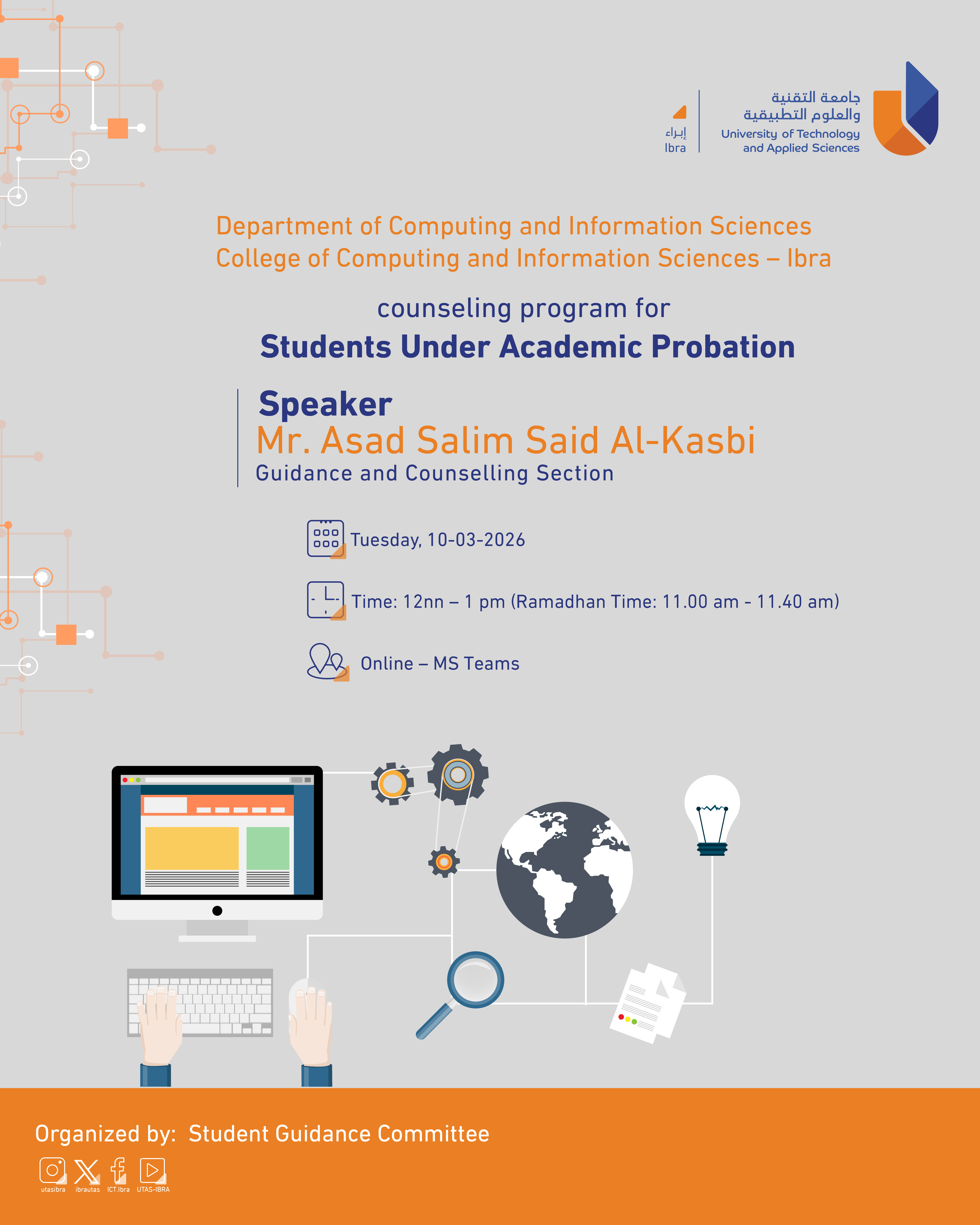 Wednesday, March 4, 2026 / Categories: Announcements, Information Technology counseling program for Students Under Academic Probation Department of Computing and Information Sciences College of Computing and Information Sciences - Ibra Previous Article First Aid and CPR Training Workshop for PSC students Next Article Mid Term Examinations Draft version semester 2 2025-2026 Print 18 Rate this article: No rating