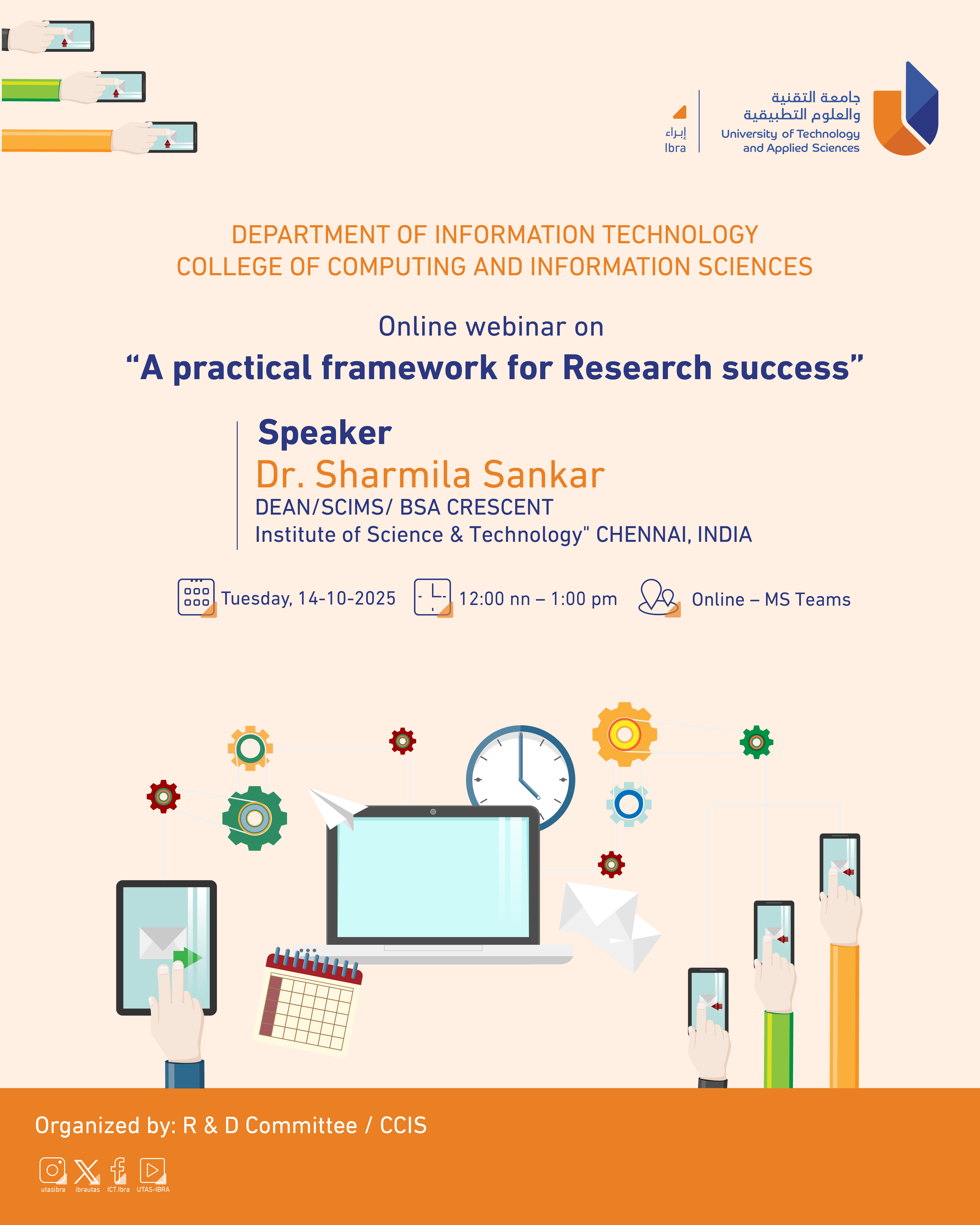Thursday, October 9, 2025 / Categories: Announcements, Information Technology Online webinar on “A practical framework for Research success” College of Computing and Information Sciences Previous Article Industrial Visit - Crowe Audit Firm, Muscat Next Article Design of Solar PV System for Domestic Application Print 21 Rate this article: 1.0