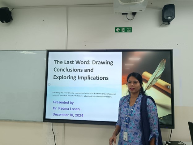 Dr. Padmalosani provided insightful guidance on how to craft impactful conclusions and delve into the broader implications of research findings. The session covered key aspects such as: