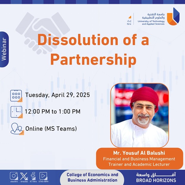 A guest lecture was successfully organized on April 29, 2025 for BSAC2206 - Corporate Accounting 1 students via MS Teams. Dr. Yusof Al Balushi, Financial and Business Management Trainer and Academic Lecturer and also a seasoned expert with over 25 years of experience in the Financial Services sector was the guest speaker. The session offered deep insights into the complexities of “Partnership Dissolution”, a key topic in the Corporate Accounting subject.