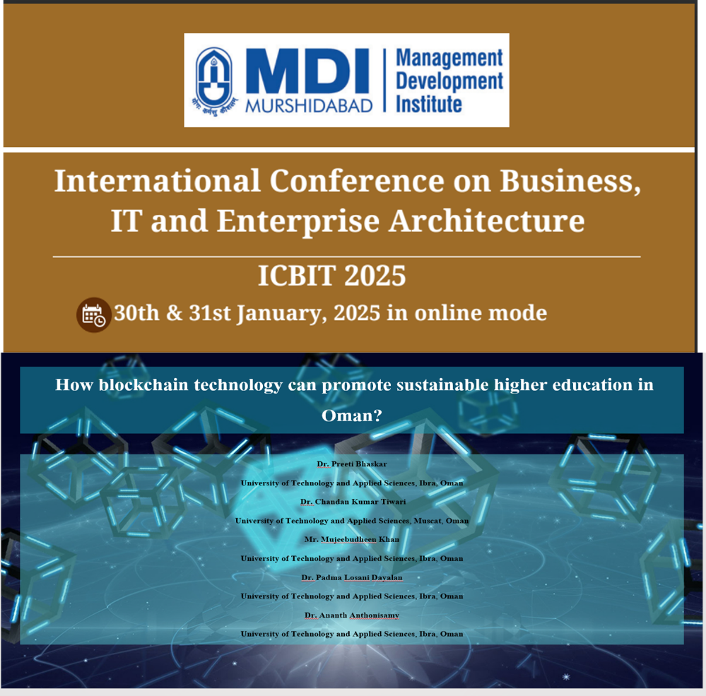 Dr. Preeti Bhaskar, Dr. Padmalosani Dayalan, Dr. Ananth Anthonisamy, and Mr. Mujeebudheen Khan from the University of Technology and Applied Sciences (UTAS) Ibra received the Best Research Paper Presentation Award for their paper titled "How Blockchain Technology Can Promote Sustainable Higher Education in Oman" at ICBIT 2025. The paper explores the potential of blockchain technology in addressing critical challenges within Oman’s higher education system, promoting transparency, efficiency, and sustainability.