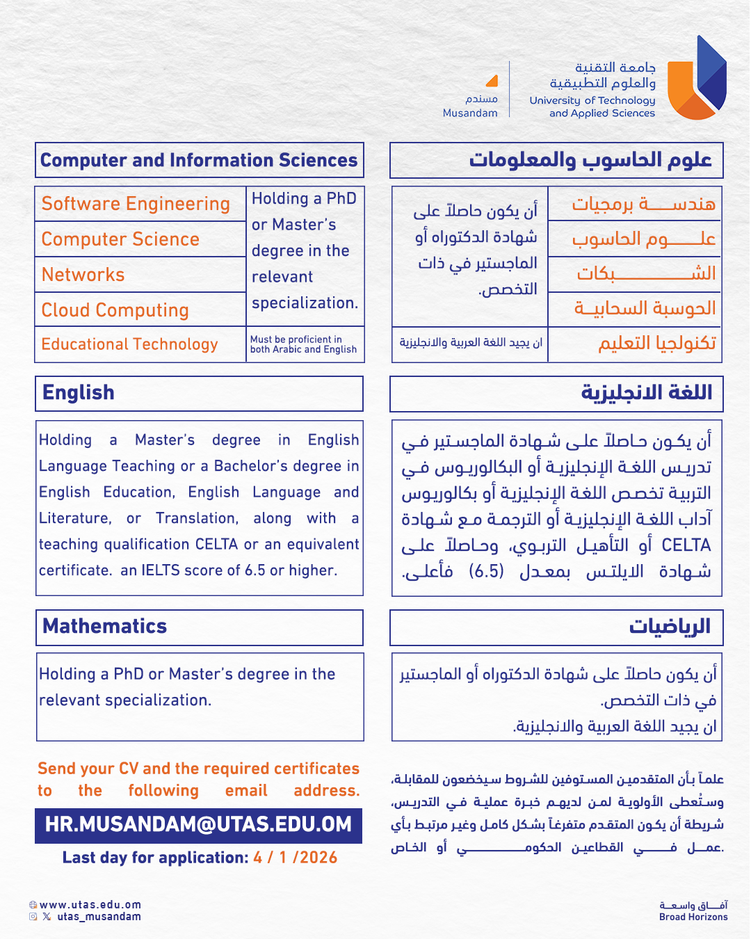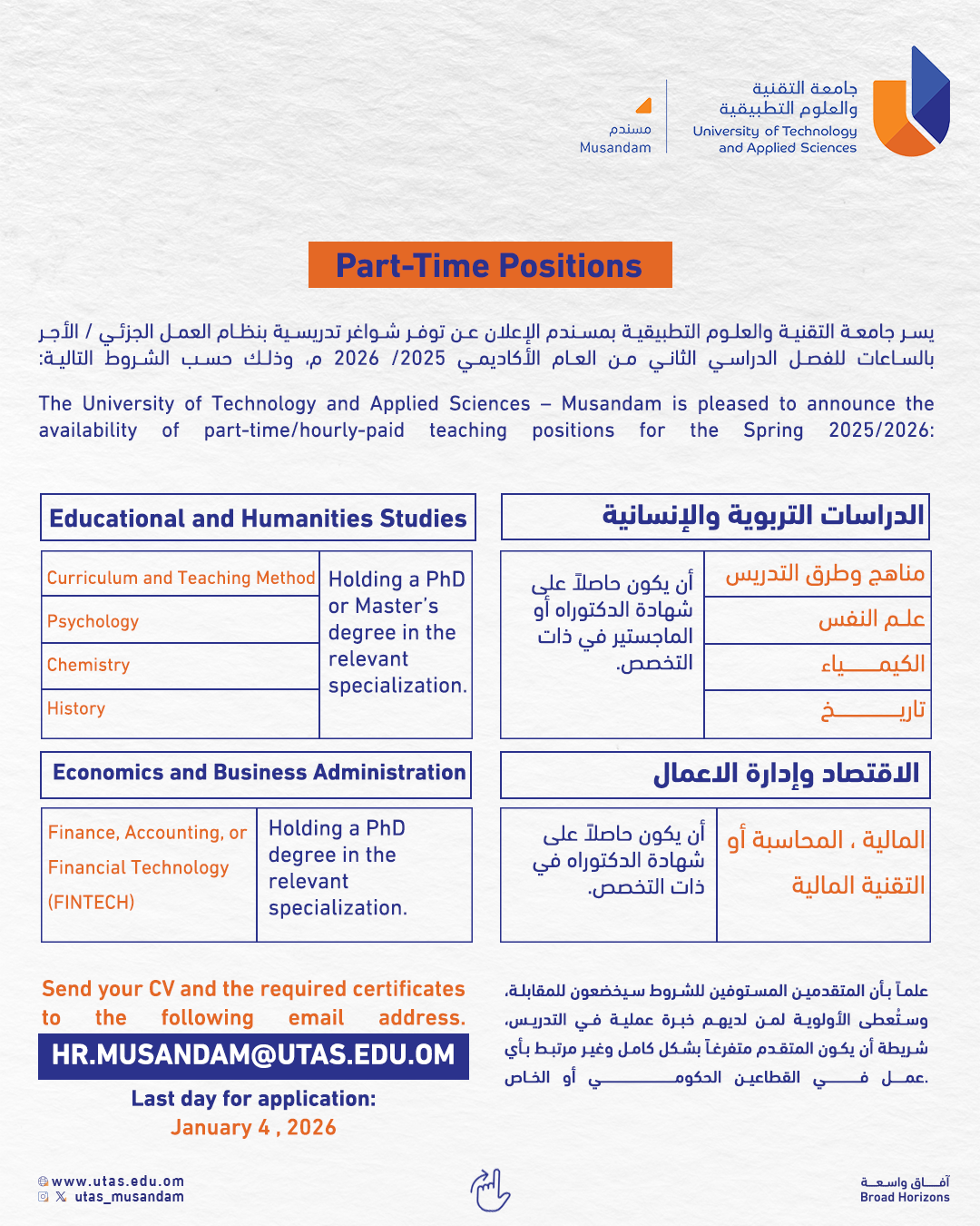 UTAS Musandam announces the availability of part-time teaching vacancies for the second semester of the academic year 2025/2026.