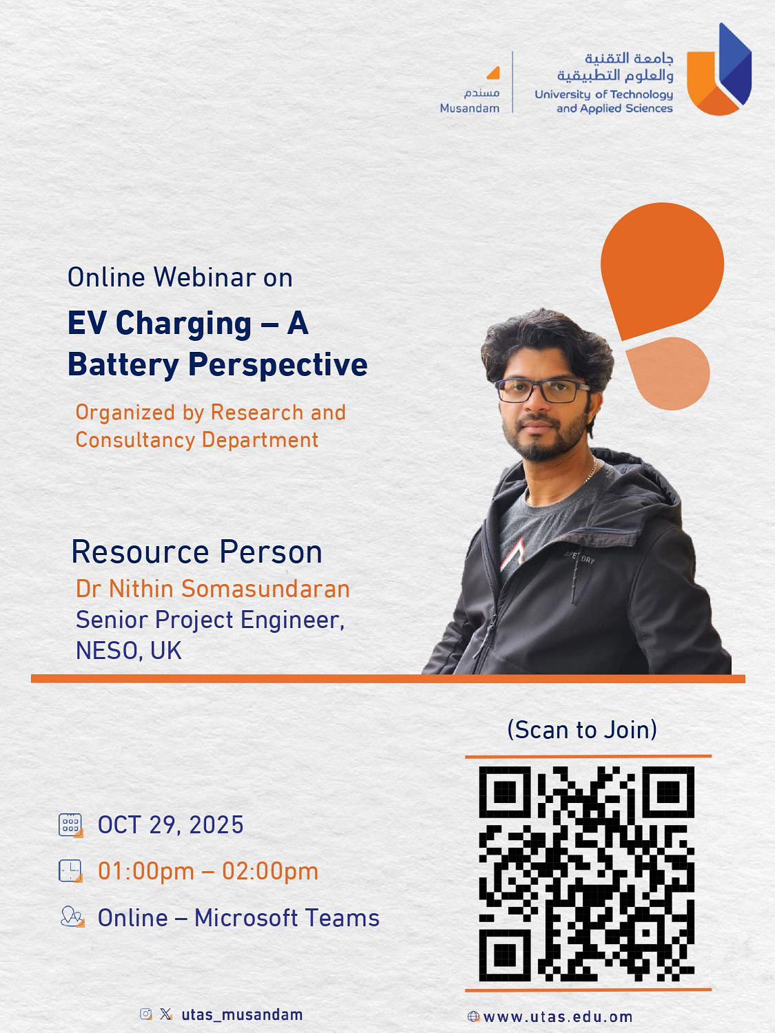 Tuesday, October 28, 2025 / Categories: Announcements Online Seminar on “EV Charging – A Battery Perspective An online seminar entitled “EV Charging – A Battery Perspective” will be presented by Dr. Nithin Somasundaran, Senior Project Engineer, NESO, UK. Previous Article ورشة عمل بعنوان «رصد الملوثات الكيميائية والعناصر المعدنية في المنتجات الحيوانية» Next Article ورشة عمل بعنوان «المواطنة الرقمية في المؤسسات العامة والخاصة ومؤسسات التعليم والتدريب – الآثار والتحديات» Print 32 Rate this article: No rating