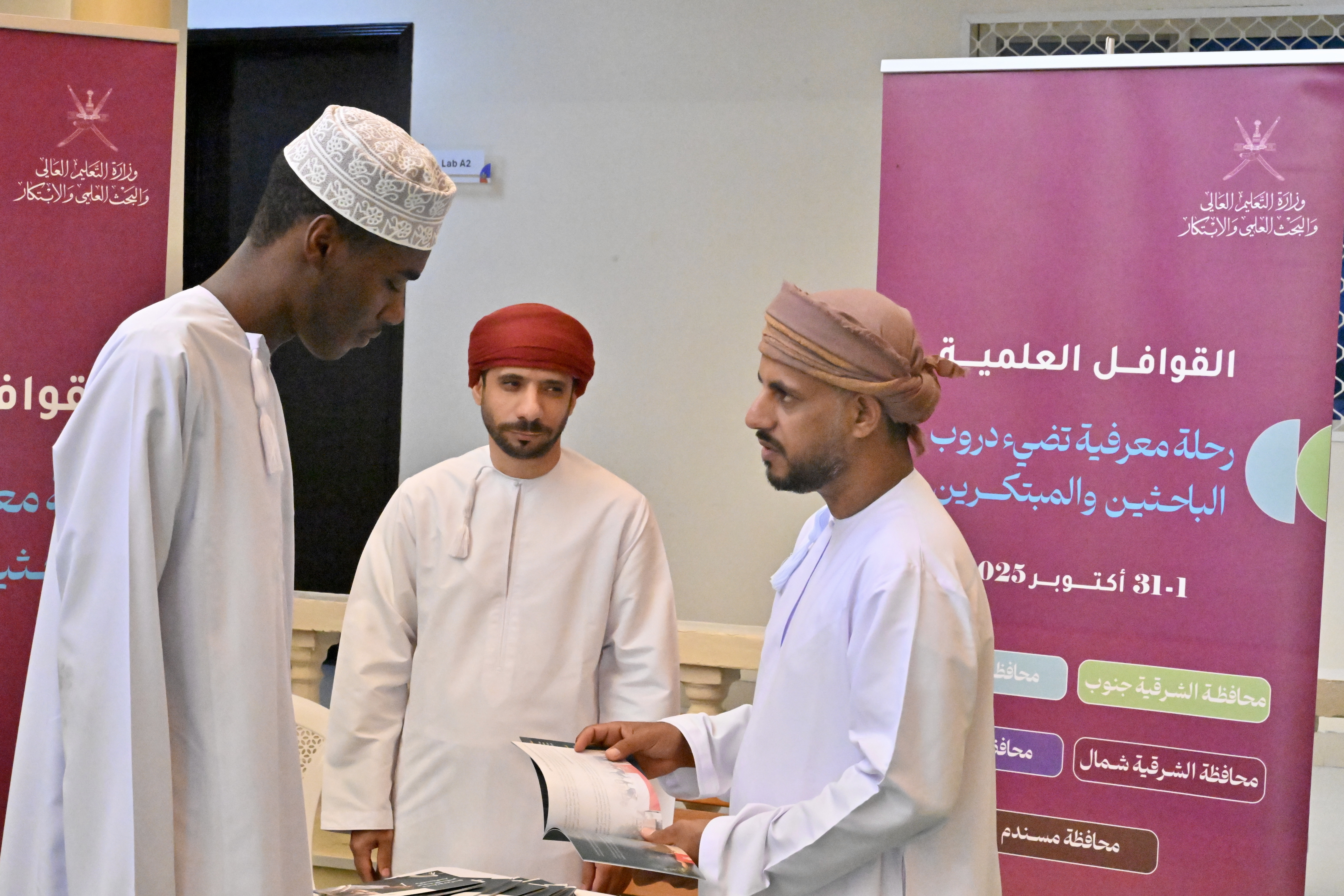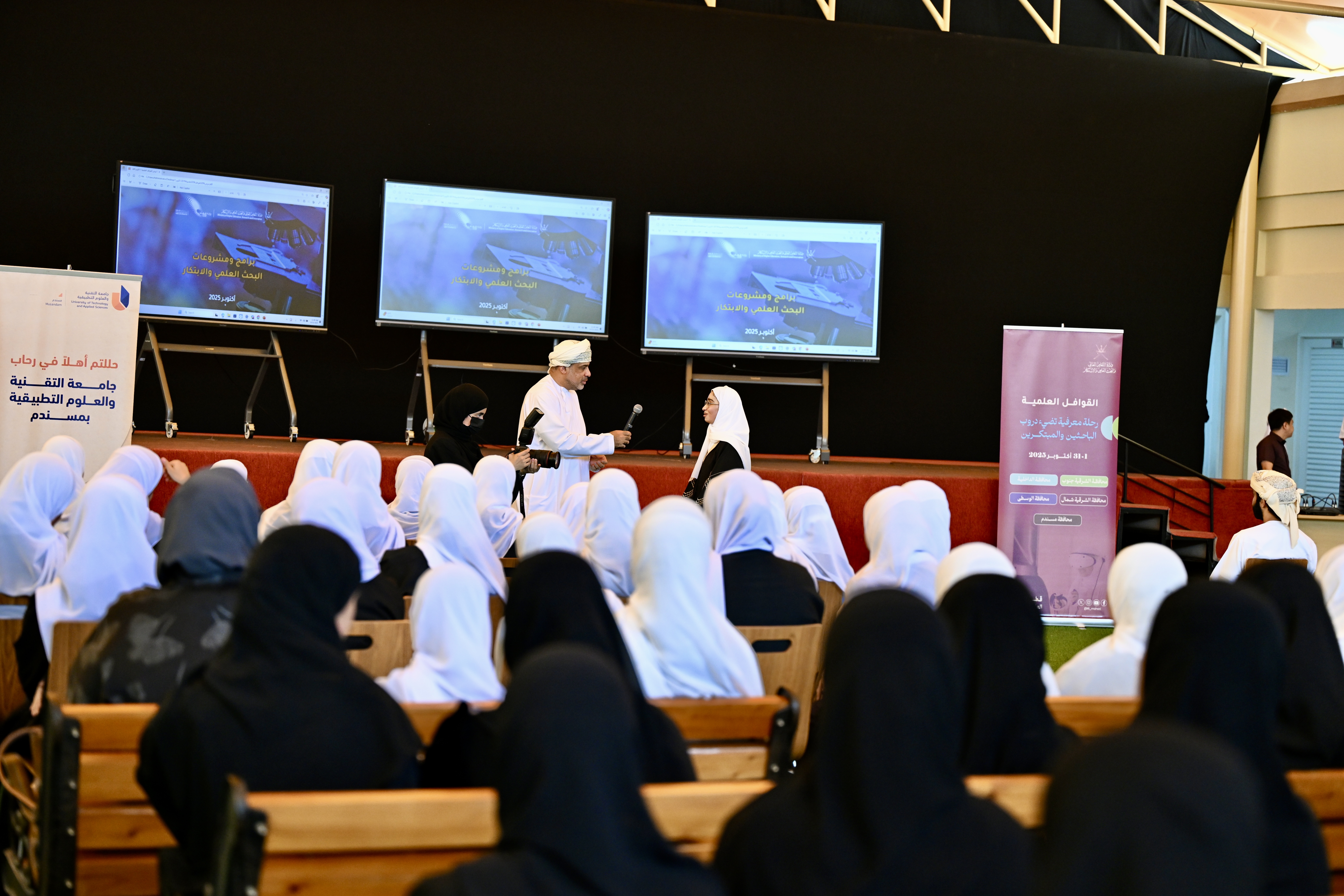 The University of Technology and Applied Sciences – Musandam welcomed the Scientific Convoys team from the Ministry of Higher Education, Research, and Innovation. An informative exhibition and awareness lecture on scientific research and innovation programs and projects were organized, attended by academic and administrative staff, university students, and school students.