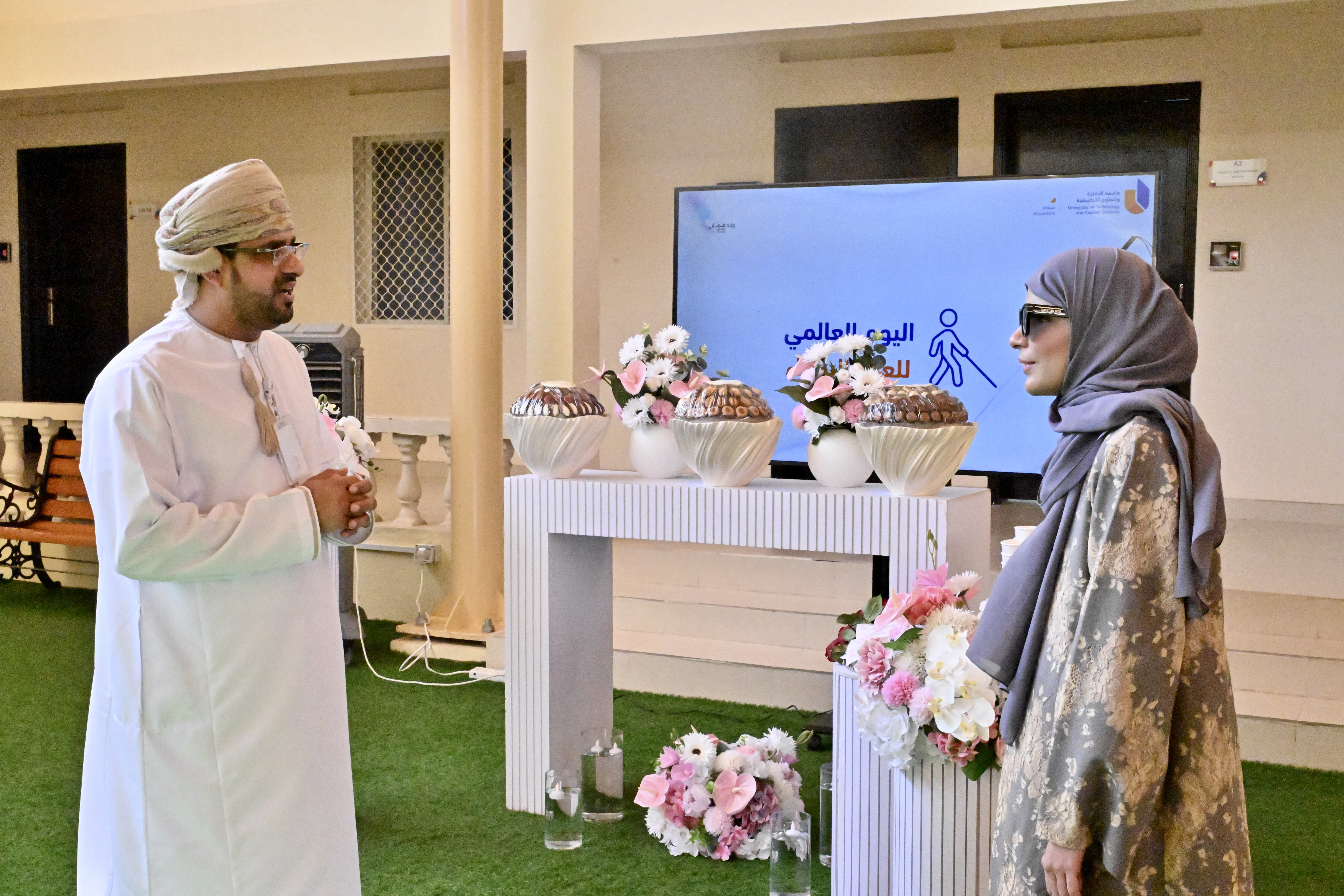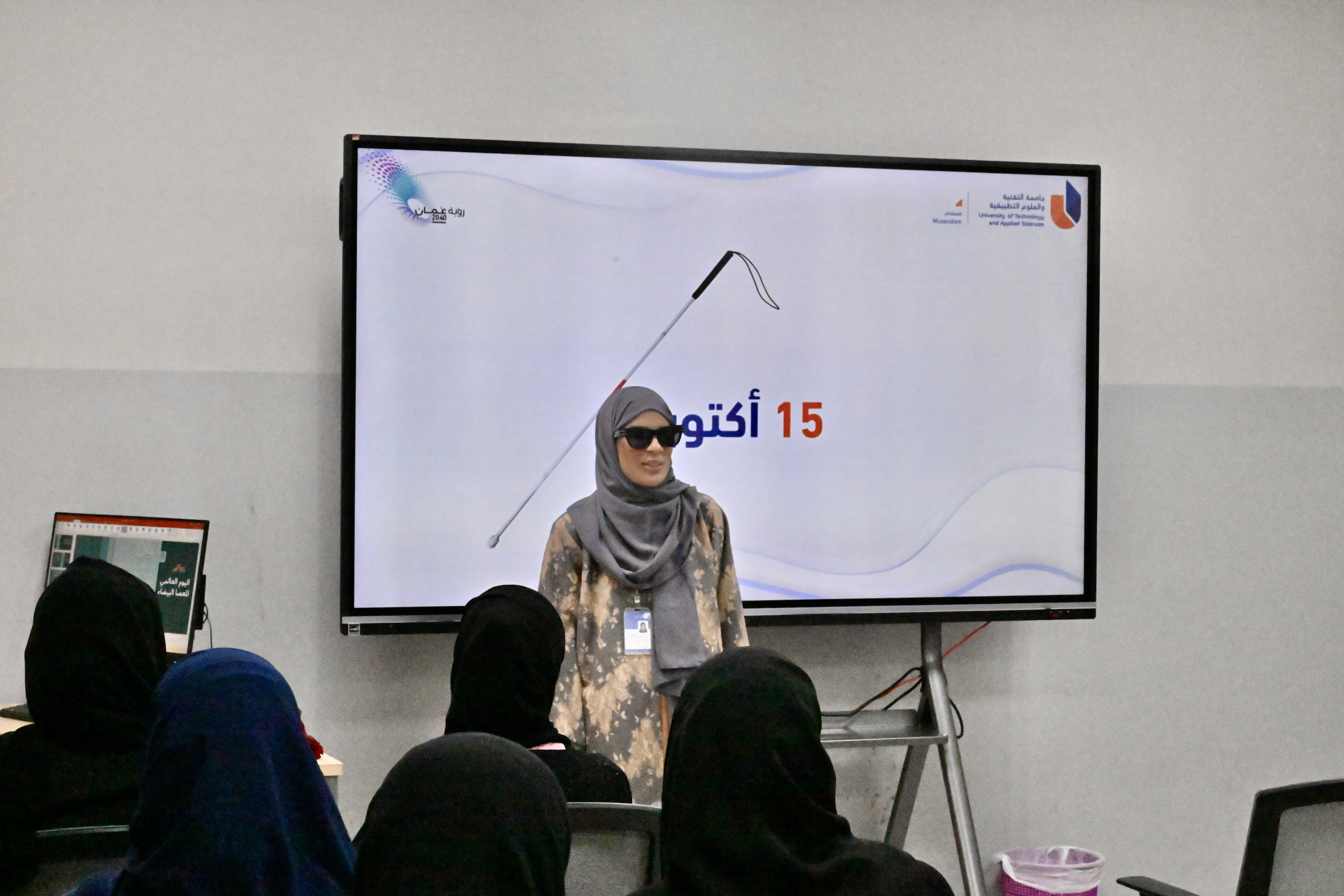 The event “The White Cane… The Eye of the Visually Impaired” was presented by Ms. Noura Al-Kamzari at the University of Technology and Applied Sciences in Musandam. The event aimed to introduce participants to the white cane and its importance for visually impaired individuals, familiarize them with its types, and provide practical training on how to use it. Additionally, it sought to raise community awareness about the importance of respecting and supporting people with visual impairments.