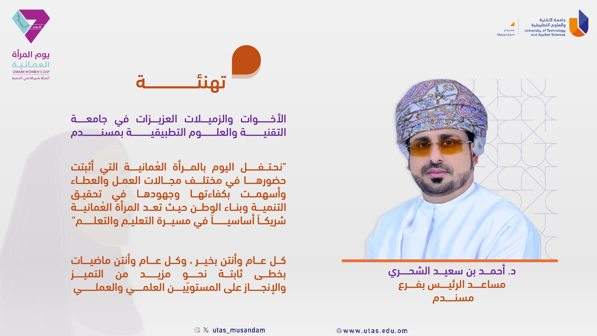The University of Technology and Applied Sciences in Musandam celebrated Omani Women’s Day in appreciation of the Omani woman’s role and her continuous contributions to the nation’s development and progress.