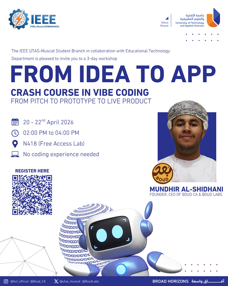 Wednesday, April 15, 2026 / Categories: Information Technology FROM IDEA TO APP: Crash Course in Vibe Coding – From Pitch to Prototype to Live Product Previous Article The 1st International Conference on Business Sustainability: Enhancing Oman’s Innovation and Investment Ecosystem ICBS26 Next Article وصل حديثاً على رفوف المكتبة Print 60