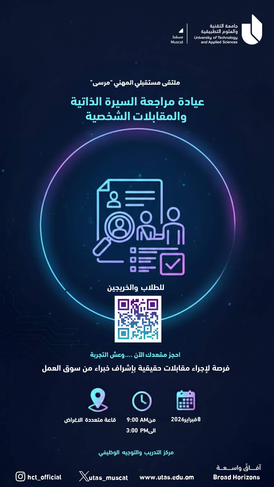 Sunday, January 25, 2026 / Categories: Announcements, TCGC "ملتقى مستقبلي المهني "مرسى Previous Article Students and staff about the current adviser assignments- IT department Next Article اعلان تخفيض 50 % من معهد البيان للتدريب Print 57