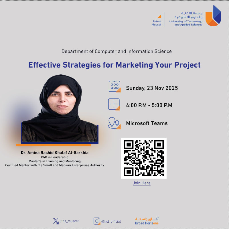 Thursday, November 20, 2025 / Categories: Announcements, Information Technology Effective Strategies for Marketing Your Project Join workshop Previous Article كيف تحسن من اجراءات عملك الاداري Next Article STUDENT INDUCTION FOR DIPLOMA FIRST YEAR IT STUDENTS Print 61