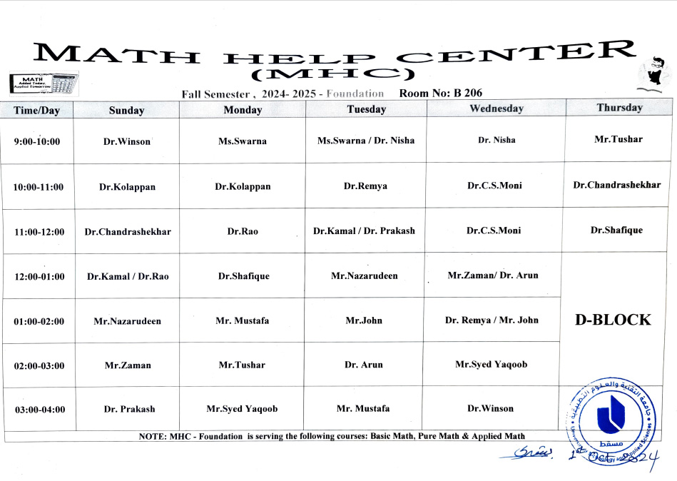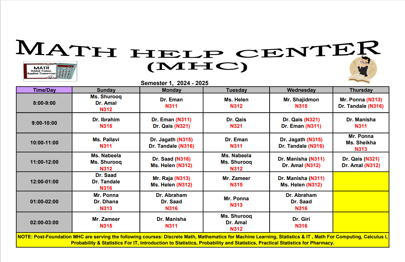 Math Help Centre Timing - semester 1, 2024-2025