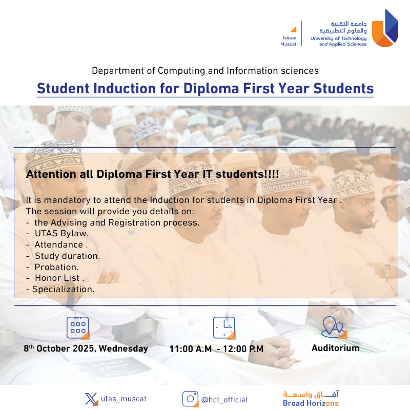 Tuesday, October 7, 2025 / Categories: Announcements, Information Technology Student Induction for Diploma First Year Students Previous Article Masader Database Next Article برنامج التفكير الابداعي والنقدي في بناء الذات المهنية Print 190