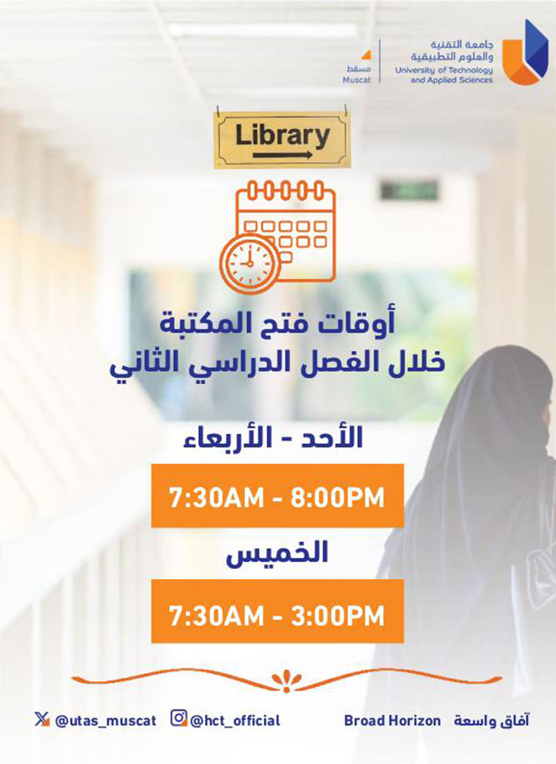 Monday, February 9, 2026 / Categories: Announcements, Educational Technology Center أوقات فتح المكتبة خلال الفصل الدراسي الثاني Print 11