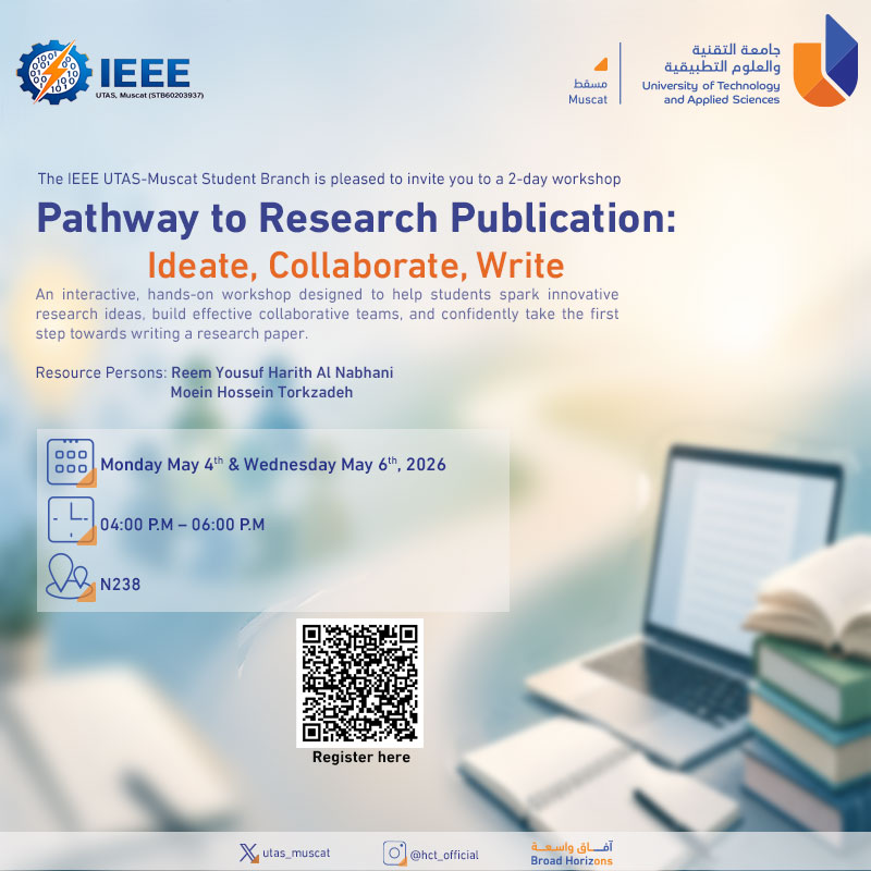 Event date: 5/4/2026 4:00 PM - 5/6/2026 6:00 PM Export event Thursday, April 30, 2026 / Categories: Events, Information Technology Pathway to Research Publication: Ideate, Collaborate, Write Register Here Previous Article Poster Day Next Article الورشة التعريفية للنظام الضريبي في سلطنة عمان Print 6