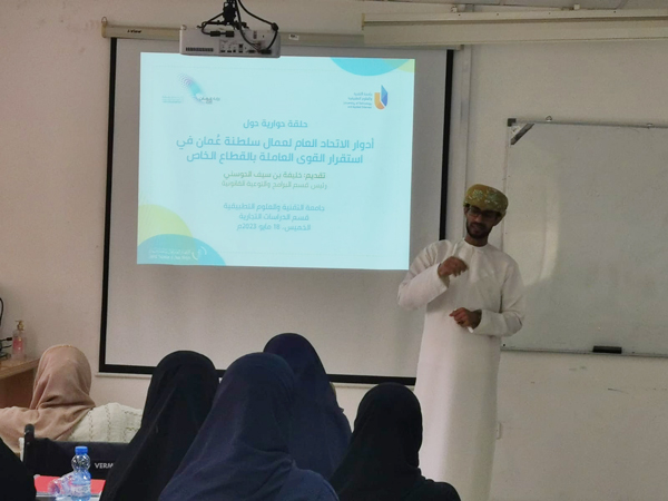 تم تنفيذ الجلسة الحوارية وورشة العمل بعنوان "أدوار الاتحاد العام للعمال بسلطنة عمان في استقرار القوى العاملة الوطنية بالقطاع الخاص" يوم الخميس 18 مايو 2023م الساعة 9:00 -11:00 صباحا. وقد شارك في هذه الجلسة الطلبة من جامعة التقنية والعلوم التطبيقية. وقد قدم المحاضر الأستاذ/ خليفة الحوسني رئيس قسم البرامج والتوعية القانونية بالاتحاد العام للعمال، نظرة عامة عن رؤية عمان 2040 وأهدافها وأولوياتها في تطوير القطاع الخاص وتعزيز دوره في النمو الاقتصادي والاجتماعي. كما تناول دور الاتحاد العام للعمال في تمثيل وحماية مصالح العاملين في هذا القطاع والتحديات التي يواجهها في ظل التغيرات المحلية والإقليمية والدولية. وأشار إلى أهمية تطوير مهارات فهم وحل المشكلات لقضايا العمالية بطريقة إبداعية وتفاعلية. وفي ختام الجلسة، تم فتح باب النقاش مع المشاركين لتبادل الآراء والرؤى المستقبلية حول كيفية تعزيز دور الاتحاد العام للعمال في استقرار القوى العاملة الوطنية بالقطاع الخاص.