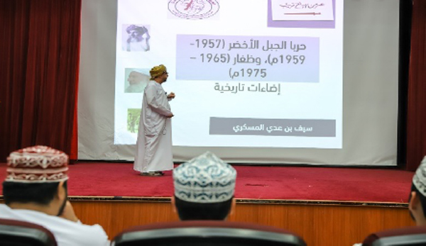تفضل الاستاذ/ سيف بن عدي المسكري-مشرف تاريخ بوزارة التربية والتعليم، بتقيدم محاضرة تاريخية، عن الاوضاع السياسية التي مرت بها عُمان قبيل عام 1970م، وقُدمت المحاضرة لطلبة مقرر عُمان الحضارة والإانسان، وذلك تحت عنوان : حربا الجبل الأخضر وظفار: إضاءات تاريخية، حيث تطرق الأستاذ إلى المؤثرات المساهمة في نشأت الإضطرابات السياسية في تلك الفترة التاريخية في خمسينيات وحتى سبعينيات القرن العشرين، وتداعيات الأوضاع المرتبطة بها، موضحًا الدوافع من هذا الحراك السياسي في تاريخ عُمان قبيل عام 1970م، إضافة إلى النتائج المترتبة عليها، وقد أشار الأستاذ سيف إلى السياسة التي اتبعت في التعامل مع هذه المتغيرات التي شهدتها عُمان.