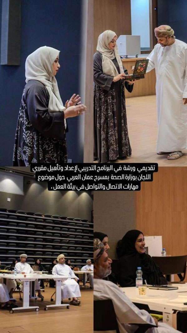 قدمت الأستاذة منيرة بنت سالم العمارية بقسم الأبتكار ونقل التكنولوجيا ورشة تدريبية عن (مهارات الأتصال الفعال في بيئة العمل) وكان من ضمن البرنامج التدريبي لبرنامج ( أعداد وتأهيل مقرري اللجان ) بوكالة وزارة الصحة للشؤون الأدارية والمالية والتخطيط الذي نفذه قسم اللجان بالوكالة. شكرا لرئيس قسم اللجان بمكتب سعادة الدكتورة وكيلة وزارة الصحة للشؤون الإدارية والمالية والتخطيط الأستاذ الفاضل / مالك اللمكي على مد جسر التعاون بيننا وبينهم