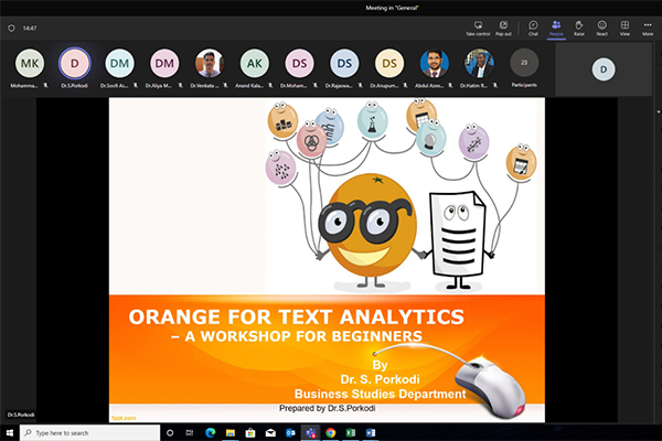 The CEBA Muscat branch organized a workshop on “ORANGE FOR TEXT ANALYTICS-A WORKSHOP FOR BEGINNERS”. This workshop was presented by Dr S. Porkodi , HRM section, Muscat Branch. The main theme of this workshop is to encourage all the faculties to have a good knowledge on research oriented platform.