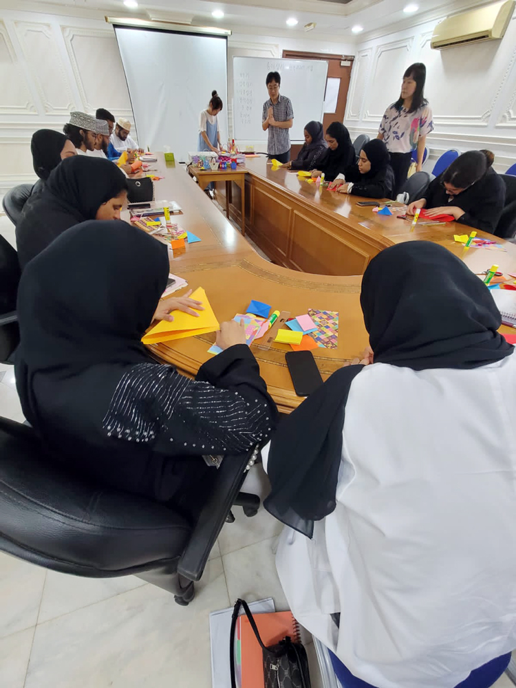 The Korean Club in English Language Center conducted a session on paper art- origami on Tuesday, 9th May 2023. Around 20 students attended the session. The Korean Club Organizer Mr. Eunsung Choi invited Ms. Soone Yoon, a talented paper craft artist from the Korean Community to share her skills with the students. Everyone enjoyed learning how to make beautiful paper crafts and festive gift baskets for occasions like Eid and birthdays. As part of the activity, the students were encouraged to develop creative and practical skills that they could use for themselves or to start businesses at some point in their lives. The students were delighted with their paper creations and took them home with pride. They thanked Ms. Yoon for her kind and enjoyable lesson and vowed to keep practicing such a valuable skill.
