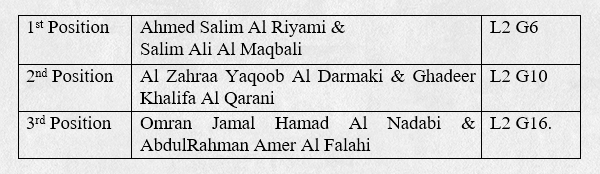 The Event Management Committee (EMC) of the Preparatory Studies Center, UTAS-Muscat conducted the first competition of the Fall Semester AY 2023-2024 on Tuesday, 24th October. The competition was for students in the Level 1 & Level 2 General Foundation Program. There were 38 students who were grouped into 19 teams. Three rounds, namely grammar-shrammar, vocabulary, and spelling the word were part of the competition. The students gave a scintillating performance and enjoyed decoding and testing their own language skills. The EMC members conducted and judged three rounds. The highest-scoring teams won the first, second, and third places.