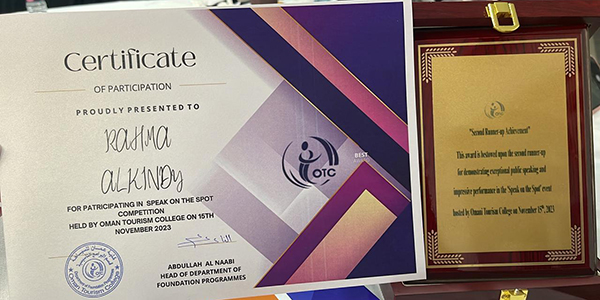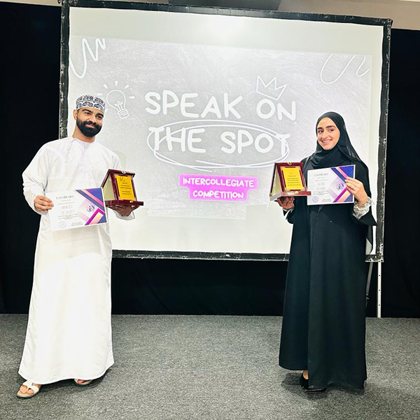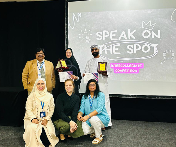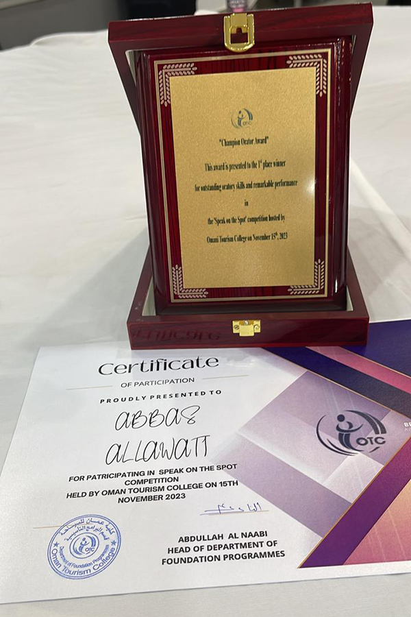 In an inter-collegiate competition “ Speak on the Spot”, conducted by Oman Tourism College, Muscat on Wednesday, 15th November, two students from UTAS-Muscat Preparatory Study Center bagged the First and Third positions. The Event Management Committee of the Preparatory Study Center mentored the students for the event. The competition was attended by 8 other colleges of Muscat. There were 14 participants who spoke on different topics for 4 minutes. Each one exhibited their best eloquence. The competition brought out quick thinking and oratory skills. They were judged on the criteria of content, relevance to the topic, structure and organization, body language & expressions, and time. Over all it was an enjoyable and a learning experience for the students. The two students showed great fervor and poise in their respective presentation. Both of them received great words of encouragement and appreciation from the audience and respected judges.