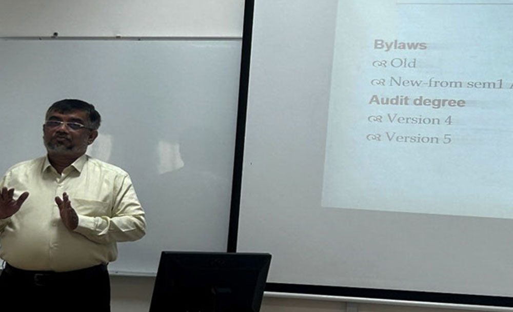 The program began with the registrar, Dr. Ghouse Sharif, discussing the academic advisement and the corresponding responsibilities of the advisors. He then briefed the participants about the rules and regulations for advisement of version 4 and version 5 students, the number of courses that can be offered each semester, different warnings for attendance according to percentages of absences, and dropping and postponing under the new and old bylaws. Before concluding his presentation, Dr. Sharif addressed various queries raised by the attendees.