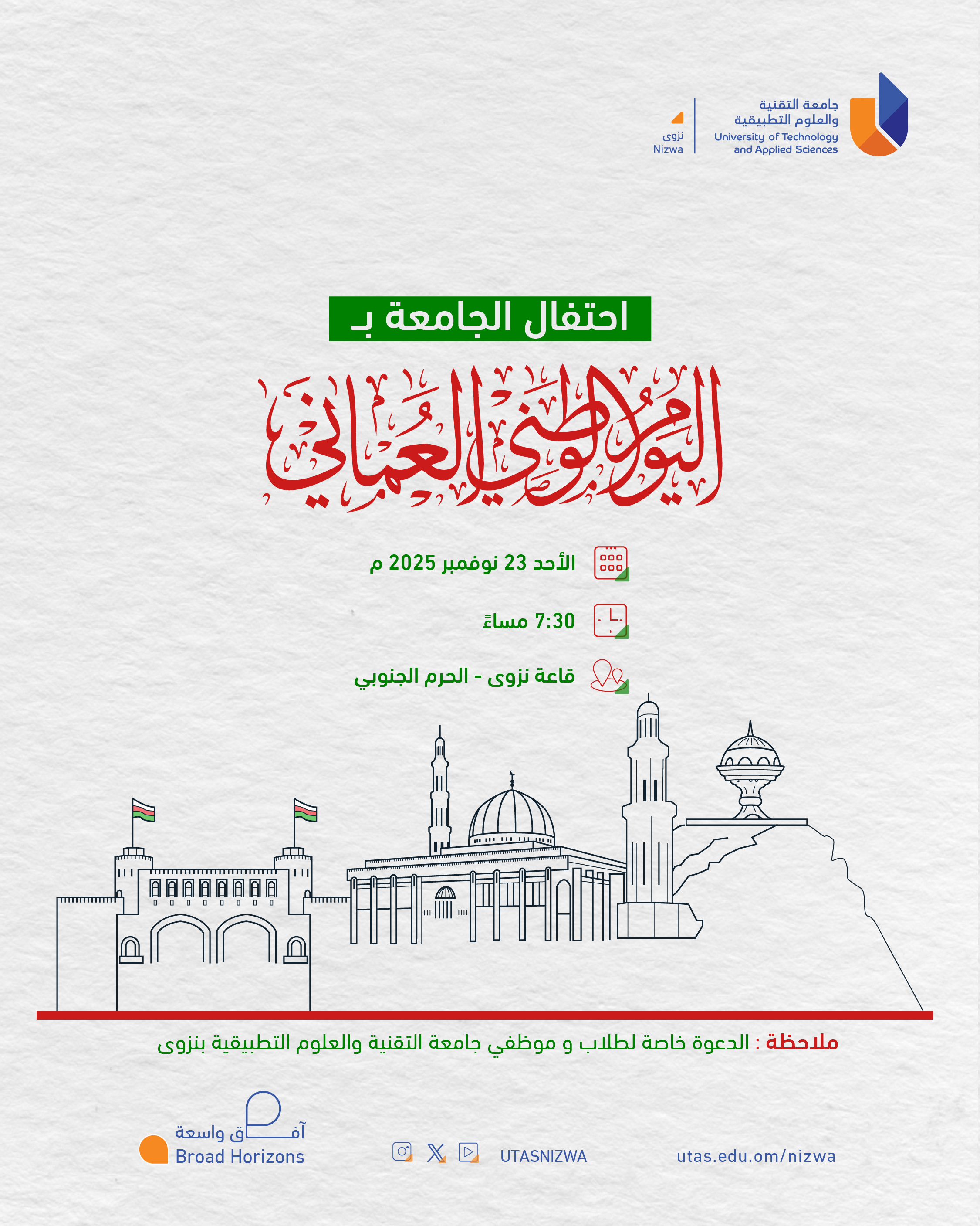 Event date: 11/23/2025 7:30 PM - 10:00 PM Export event Thursday, November 20, 2025 / Categories: Events اليوم الوطني العماني Print 1