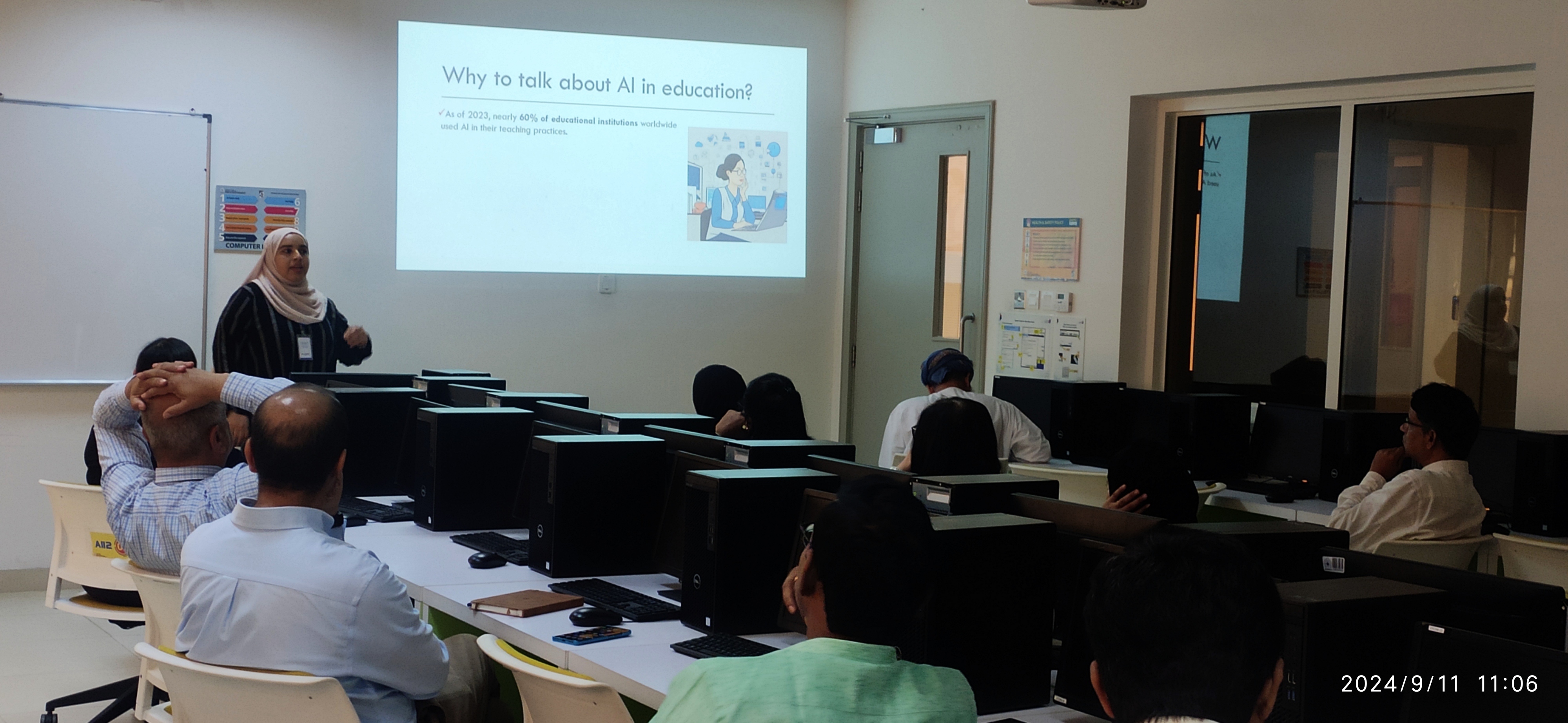 IT Department experienced an excellent PDC activity conducted by Dr. Maha Al Anqoudi today 11th September 2024. The area that she covered in her Talk was AI in Education: Shaping the Future of Teaching and Learning. A most talked about topic and she made it very interactive, interesting and mind blowing. Dr. Maha demonstarted various AI tools which could be most beneficial for the students and the teachers in the future. She also explained how students could be taught to use these tools ethically as well as fruitfully. Ms. Suad Al riyami the HoD of ITD appreciated the discussion and encouraged all the participants to participate in more such talks. Mrs. Alice Lontok also participated in this Talk and shared her views. Mr. Shivashankar welcomed the participants and introduced Dr. Maha, while Ms. Sonia concluded the activity with a brief vote of thanks.