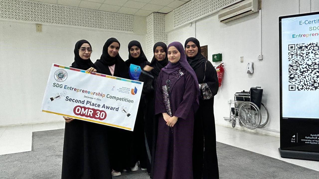 The Sustainable Development Goals (SDG)-themed poster competition, hosted by the University of Technology and Applied Sciences (UTAS) in Ibra, attracted participants from across Oman. Representing UTAS Nizwa were three teams with innovative projects. The winning group, comprising Noor Al Maskari, Safa Al Kind, and Douha Al Riyami, developed "Hand-Up," a digital app aimed at reducing food waste and improving food security. Their solution, recognized for its practicality and scalability, earned them second prize, a cash award of 30 Omani Rials, and certificates of recognition..