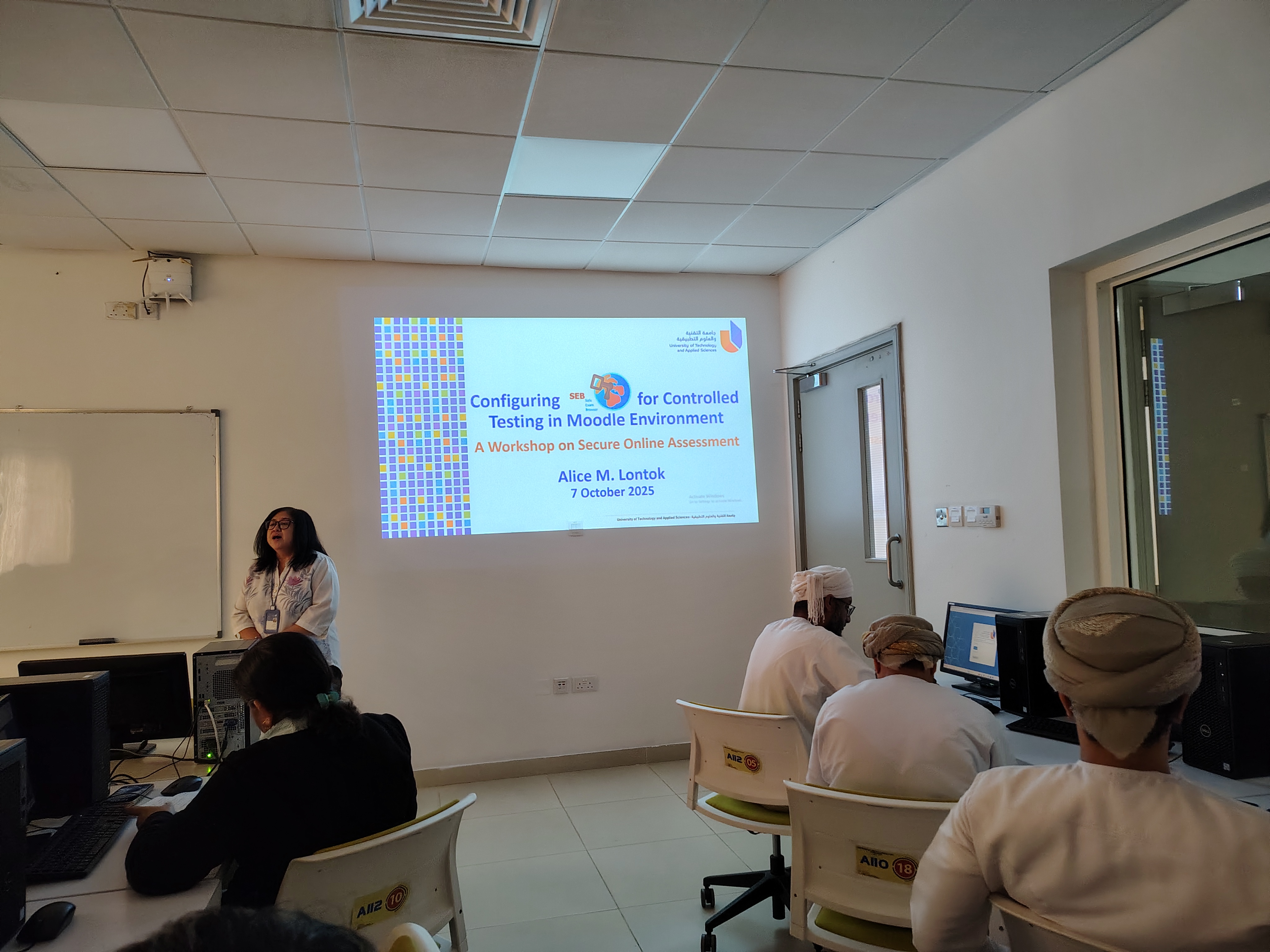 The IT Department at UTAS Nizwa conducted an informative workshop titled “Configuring SEB for Controlled Testing in Moodle Environments” on Tuesday, October 7, 2025, from 12:00 PM to 1:30 PM in Room A134. The session was facilitated by Ms. Alice M. Lontok from the SEDT section. Dr. Mohammed Ambusaidi of HoU of NWCS also graced the session.