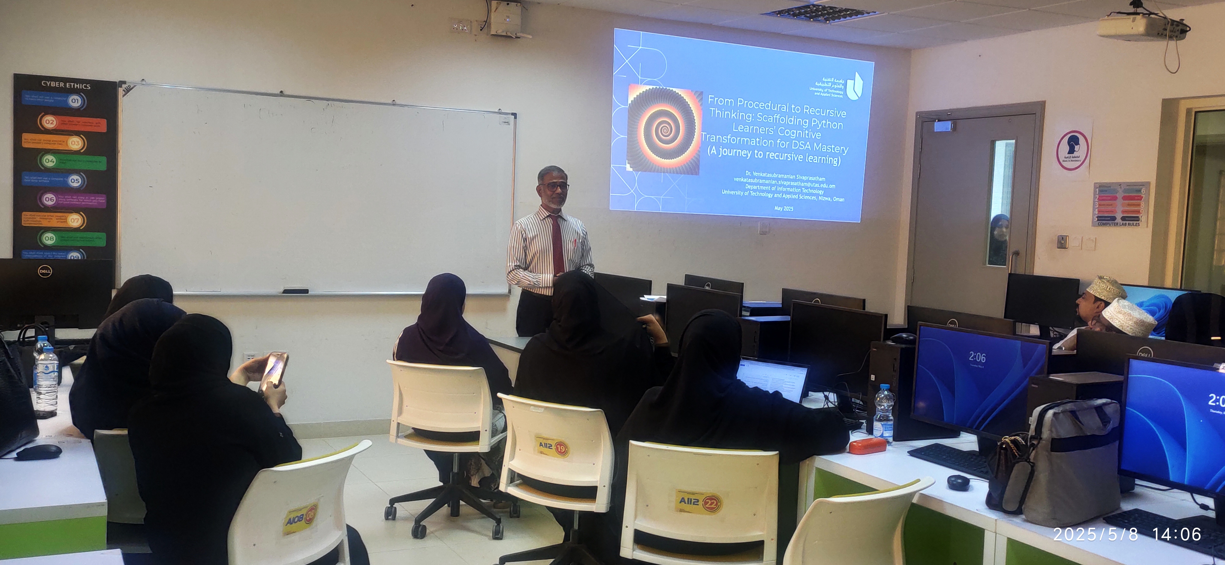 On a bright Thursday afternoon, the Information Technology Department at the University of Technology and Applied Sciences, Nizwa, hosted an engaging Internal Research Grant (IRG) presentation that left attendees buzzing with ideas. Dr. Venkatasubramanian Sivaprasatham, a dedicated faculty member, shared findings from his project, “From Procedural to Recursive Thinking: Scaffolding Python Learners’ Cognitive Transformation for DSA Mastery.” Held on May 8, 2025, from 2:00 PM to 3:00 PM in room A135, the event drew academic staff and M.Sc. students eager to explore innovative ways to teach programming.