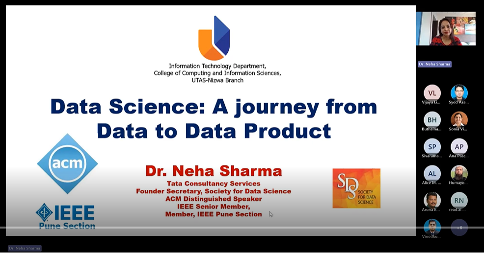 An international Webinar was hosted by the IT Department of UTAS-Nizwa today 19th Feb 2025. The resource person Dr. Neha Sharma who is working with Tata Consultancy Services is also a Founder Secretary of Society for Data Science. Prior to this she has worked as Director of premier Institute of Pune, that run post-graduation courses like MCA and MBA. She is an alumnus of a premier College of Engineering and Technology, Bhubaneshwar and completed her PhD from prestigious Indian Institute of Technology, Dhanbad. She is a Senior IEEE member and Executive Body member of IEEE Pune Section. She is an astute academician and has organized several national and international conferences and published several research papers. Besides, she is the brain behind conceptualizing International Conference of Data Management, Analytics and Innovation (ICDMAI), which has become landmark conference in the field of data science. She is the recipient of “Best PhD Thesis Award” and “Best Paper Presenter at International Conference Award” at National Level.