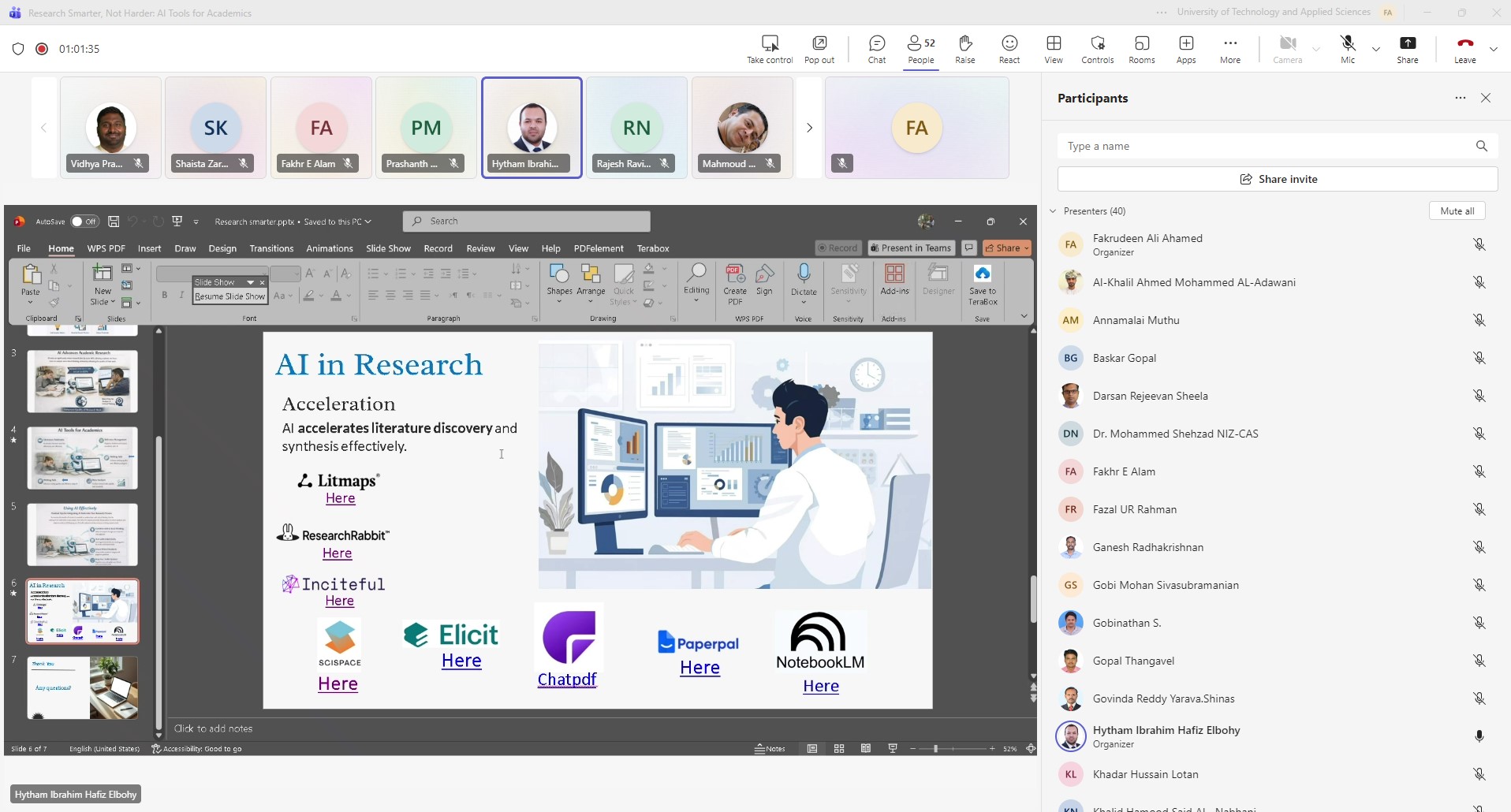 The Professional Development Committee (PDC) of Engineering, UTAS–Nizwa, in collaboration with the PDC team of the Department of Supporting Requirements, organized a online workshop titled “Research Smarter, Not Harder: AI Tools for Academics” on 17th February 2026. The session was delivered by Dr. Hytham Elbohy, Senior Lecturer in the Department of Supporting Requirements at UTAS–Nizwa. Dr. Fakrudeen, PDC Team Coordinator of the Engineering Department, served as the moderator for the session.