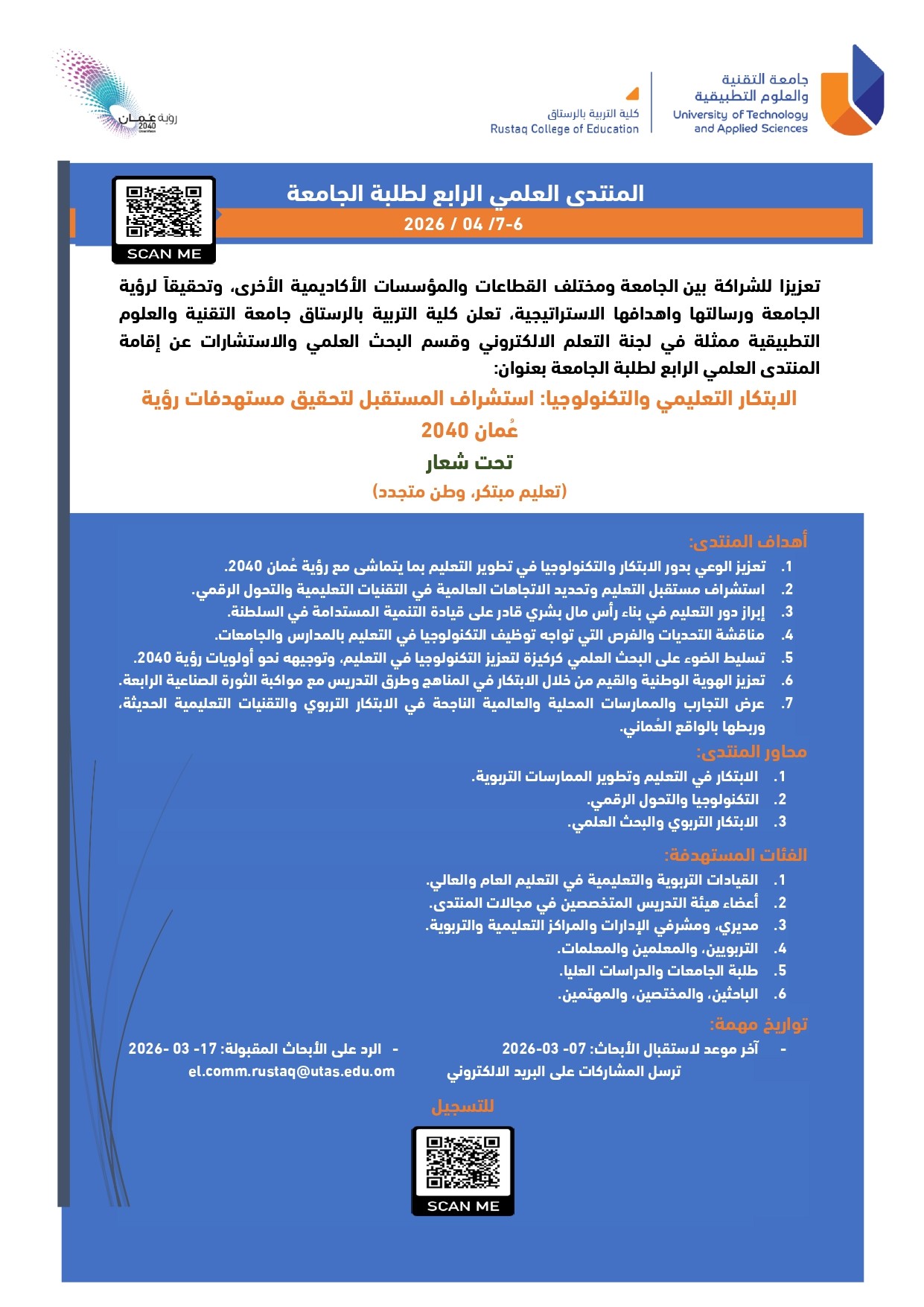 - تعزيز الوعي بدور الابتكار والتكنولوجيا في تطوير التعليم بما يتماشى مع رؤية عُمان 2040