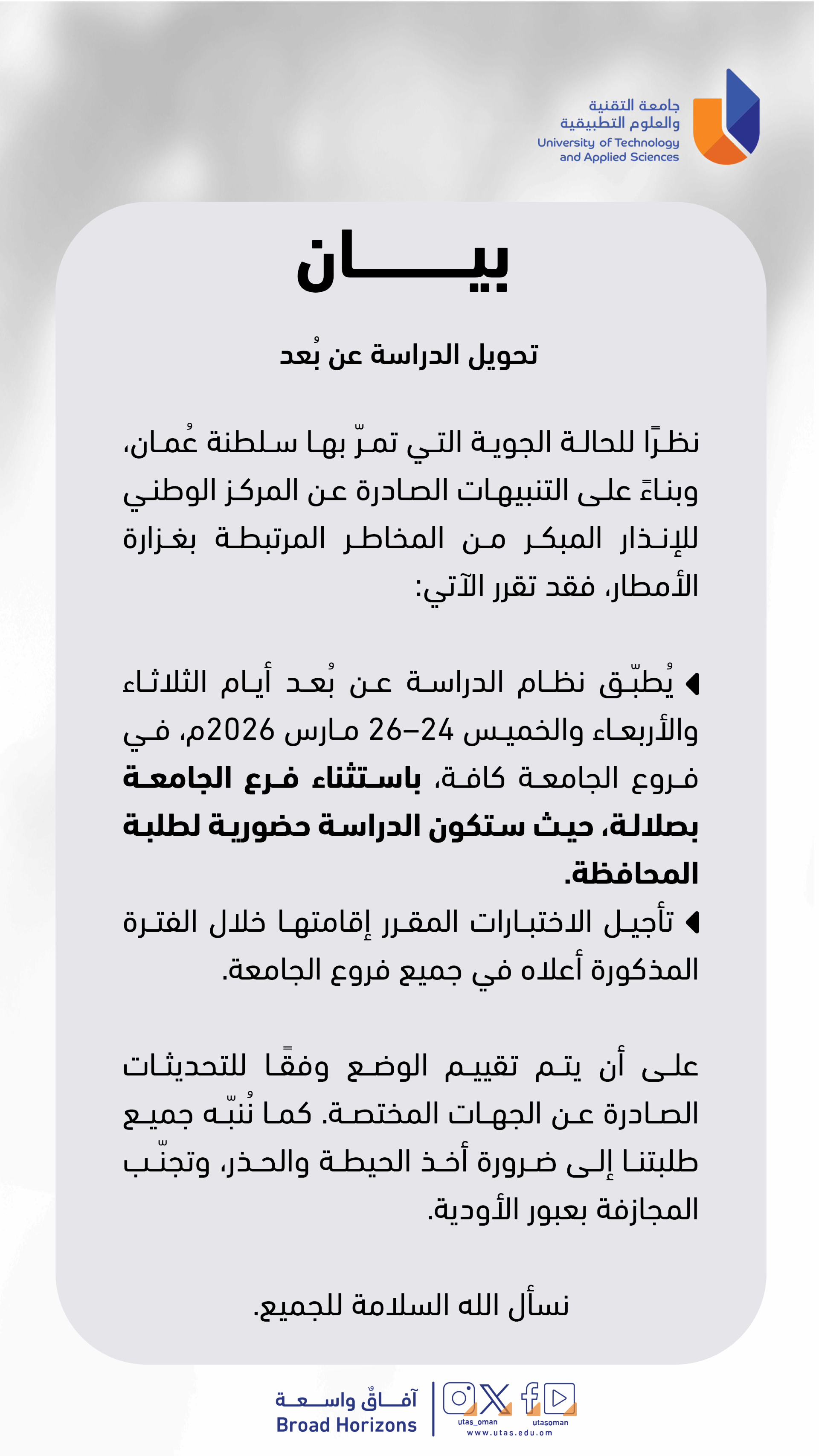 Sunday, March 22, 2026 / Categories: News, College تحويل الدراسة عن بعد تحويل الدراسة عن بعد Previous Article دعوة لحضور ورشة توظيف تطبيقات الذكاء الاصطناعي في البحث العلمي والكتابة الأدبية Next Article توجيهات وقائية Print 5
