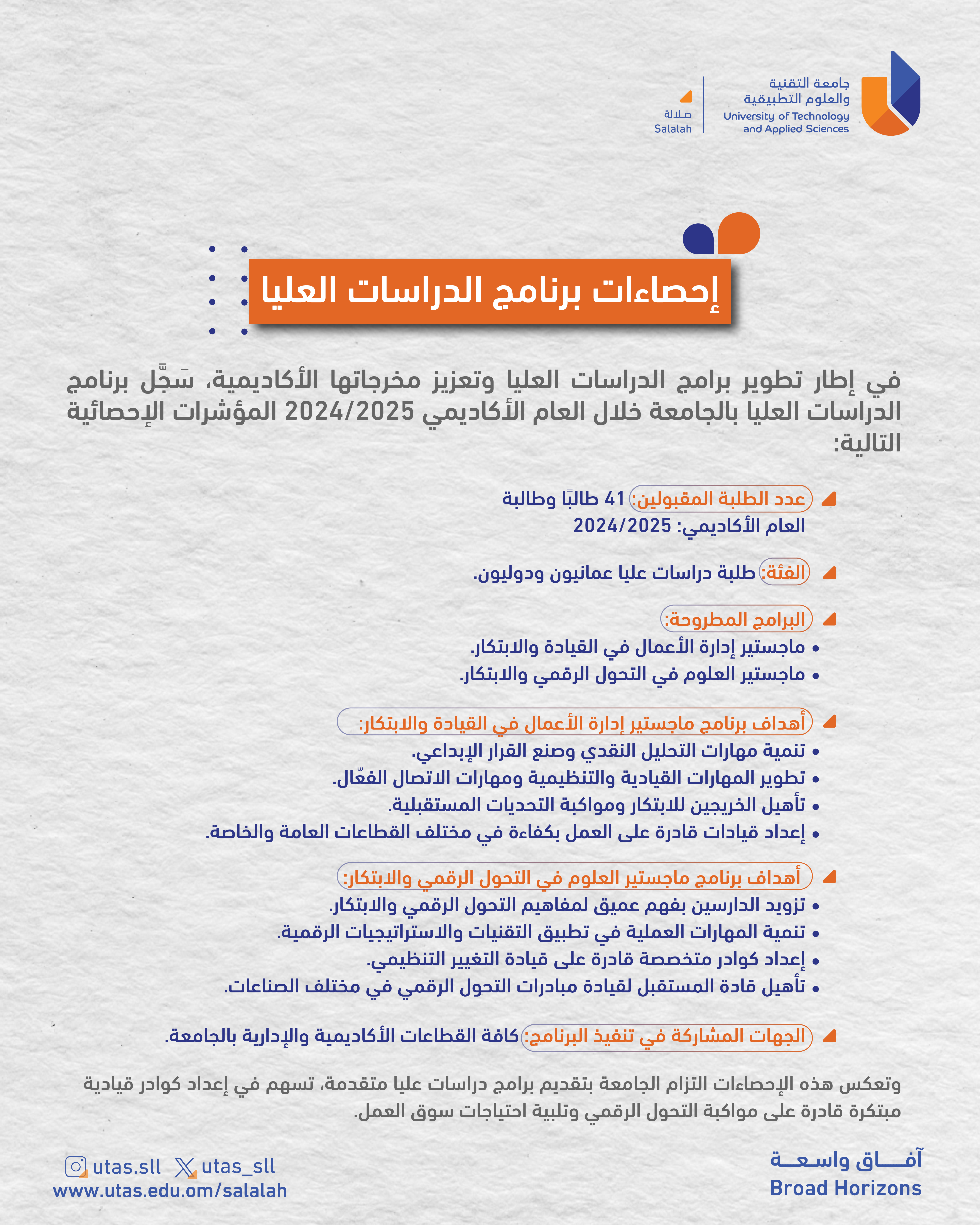 في إطار تطوير برامج الدراسات العليا وتعزيز مخرجاتها الأكاديمية، سَجَّل برنامج الدراسات العليا بالجامعة خلال العام الأكاديمي 2025/2024 المؤشرات الإحصائية المرفقة، وتعكس هذه الإحصاءات التزام الجامعة بتقديم برامج دراسات عليا متقدمة، تسهم في إعداد كوادر قيادية مبتكرة قادرة على مواكبة التحول الرقمي وتلبية احتياجات سوق العمل.