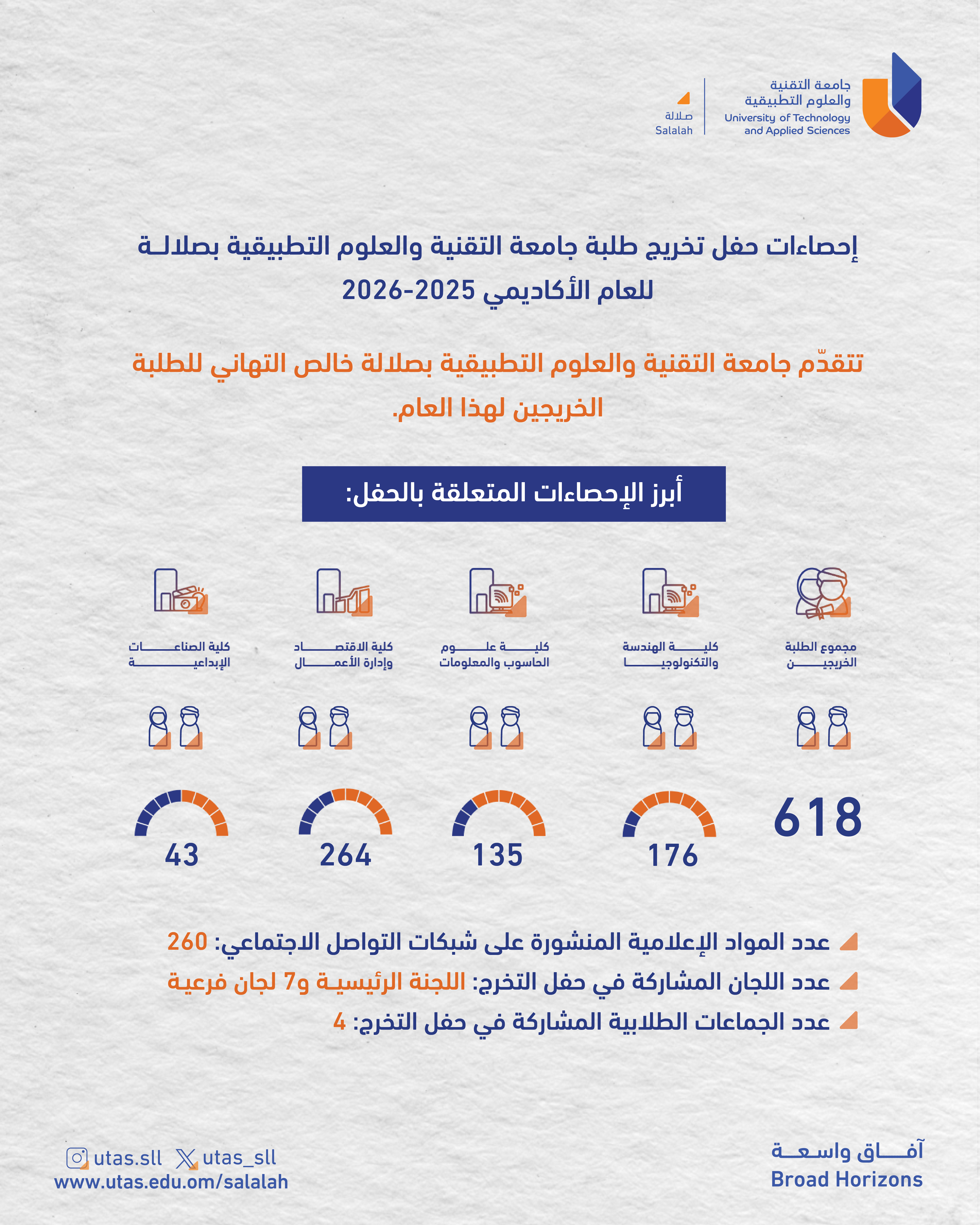 إحصاءات حفل تخريج طلبة جامعة التقنية والعلوم التطبيقية بصلالة للعام الأكاديمي 2025–2026
