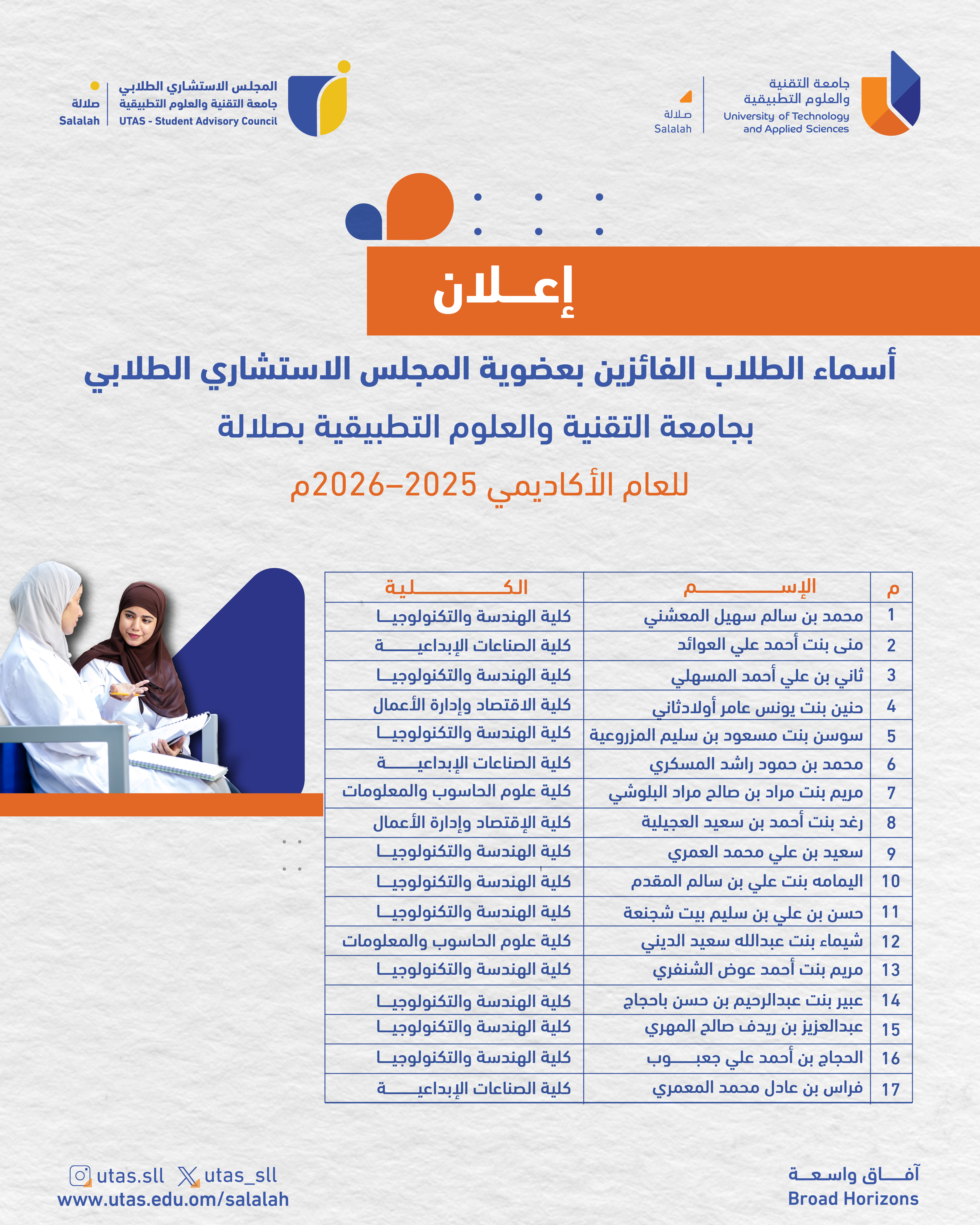 Thursday, September 25, 2025 / Categories: Announcements, General الطلاب الفائزين بعضوية المجلس الاستشاري الطلابي ✨أسماء الطلاب الفائزين بعضوية المجلس الاستشاري الطلابي بجامعة التقنية والعلوم التطبيقية بصلالة للعام الأكاديمي 2025–2026م.✨ Previous Article المركز الثاني في المسابقة الابتكارية ضمن مبادرة حملة القيادة نحو المستقبل الأخضر Next Article مقابلة مع الدكتور سعيد بن عمر بن محمد المشيخي، رئيس قسم الهندسة والتكنولوجيا Print 9 Rate this article: No rating