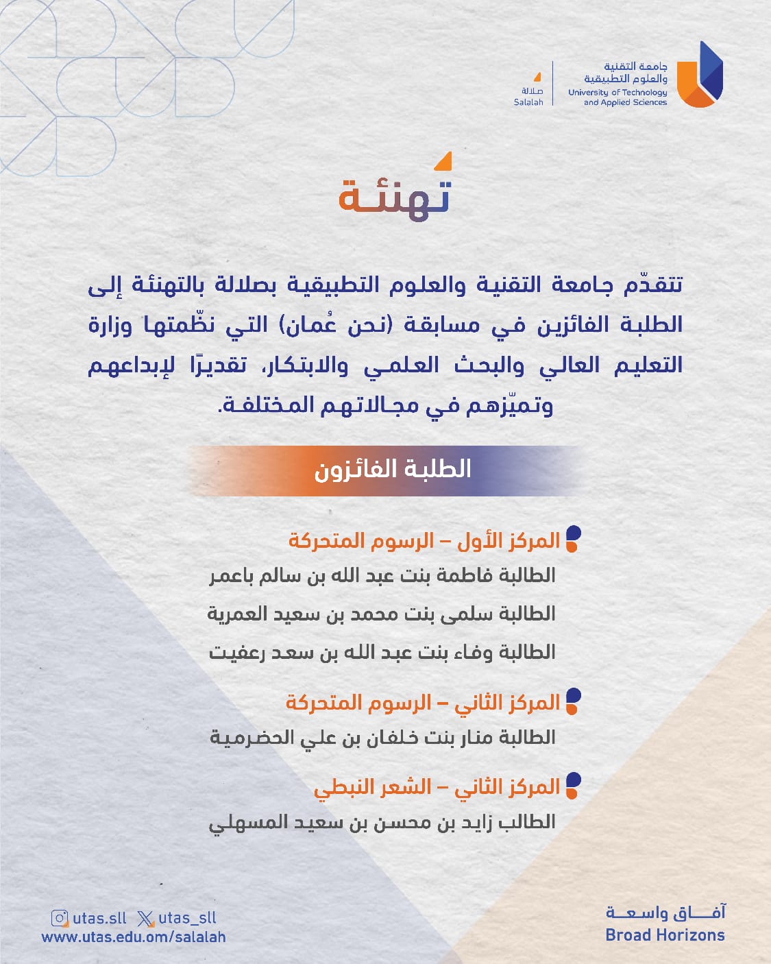 ✨ تتقدّم جامعة التقنية والعلوم التطبيقية بصلالة بخالص التهاني إلى طلبتها الفائزين في مسابقة "نحن عُمان" التي نظّمتها وزارة التعليم العالي والبحث العلمي والابتكار، تقديرًا لإبداعهم وتميّزهم في مجالاتهم المختلفة.✨
