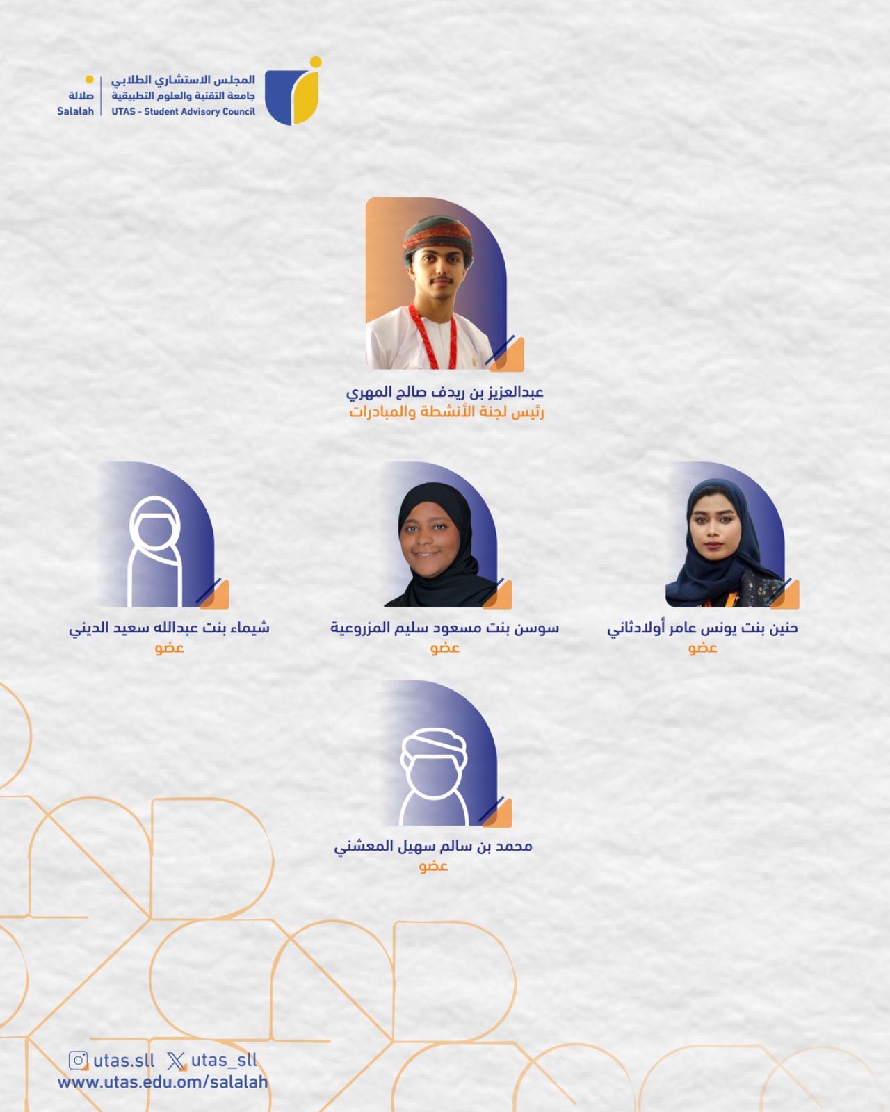 ✨تتقدّم جامعة التقنية والعلوم التطبيقية بصلالة بالتهنئة إلى أعضاء المجلس الاستشاري الطلابي للعام الأكاديمي 2025–2026م، متمنيةً لهم دوام التوفيق والتميّز في أداء مهامهم، وعامًا أكاديميًا حافلًا بالإنجازات والعطاء.✨
