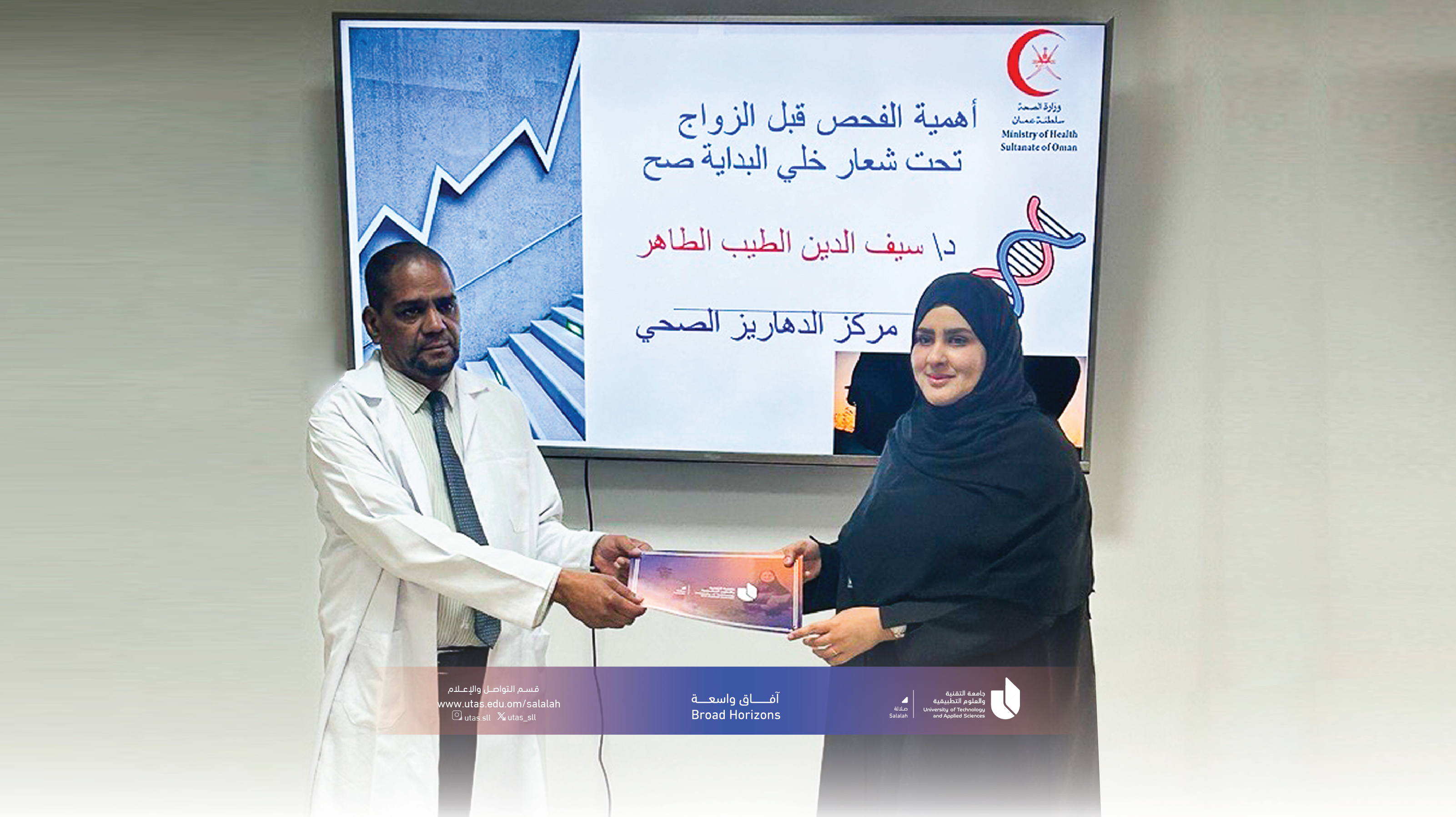 نظَّم قسم التعليم المستمر وخدمة المجتمع بالتعاون مع مركز الدراسات التحضيرية بجامعة التقنية والعلوم التطبيقية بصلالة محاضرة توعوية بعنوان «الحملة الوطنية للفحص الطبي قبل الزواج»، يوم الثلاثاء 11 نوفمبر في مركز التعلم الذاتي (SAC).