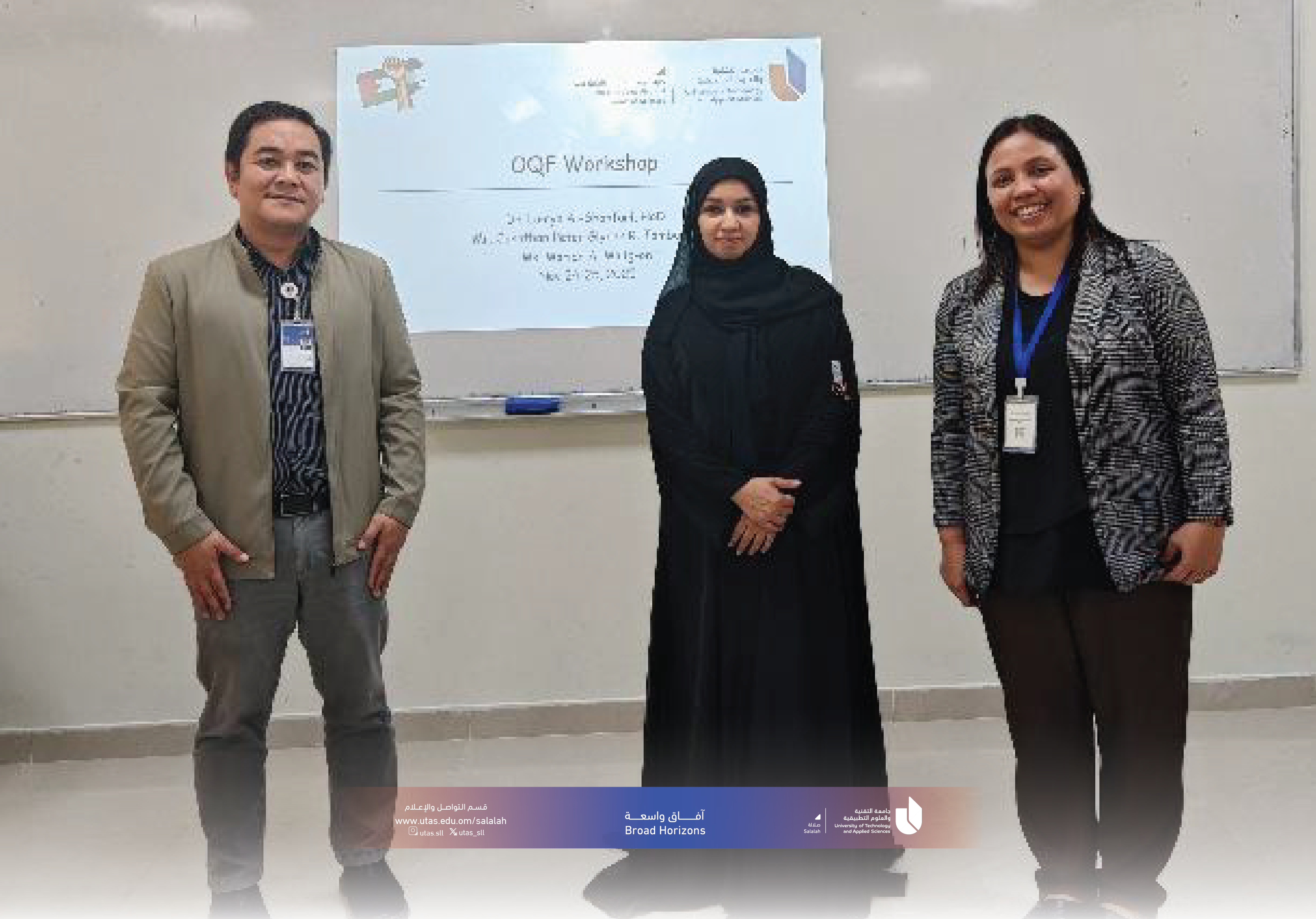 The University of Technology and Applied Sciences (UTAS) conducted a workshop titled “Building Capacity on the Oman Qualifications Framework (OQF)” at UTAS–Salalah on November 24–25, 2025. The workshop was delivered by Dr. Lamya Al-Shanfari, Mrs. Marian Malig-on, and Mr. Jonathan Glycer Tambaoan, with the participation of CCIS lecturers. It aimed to introduce the OQF and enhance its application in course evaluation, reflecting UTAS’s commitment to quality and national standards.