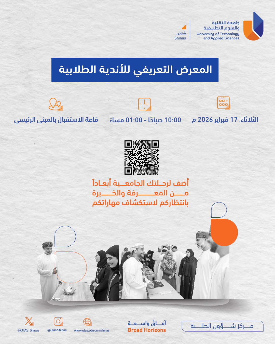 Sunday, February 15, 2026 / Categories: Announcements المعرض التعريفي للأندية الطلابية Previous Article ورشة عوامل التحفيز الداخلية والخارجية في بيئة العمل Next Article التدقيق الداخلي Print 28 Rate this article: No rating