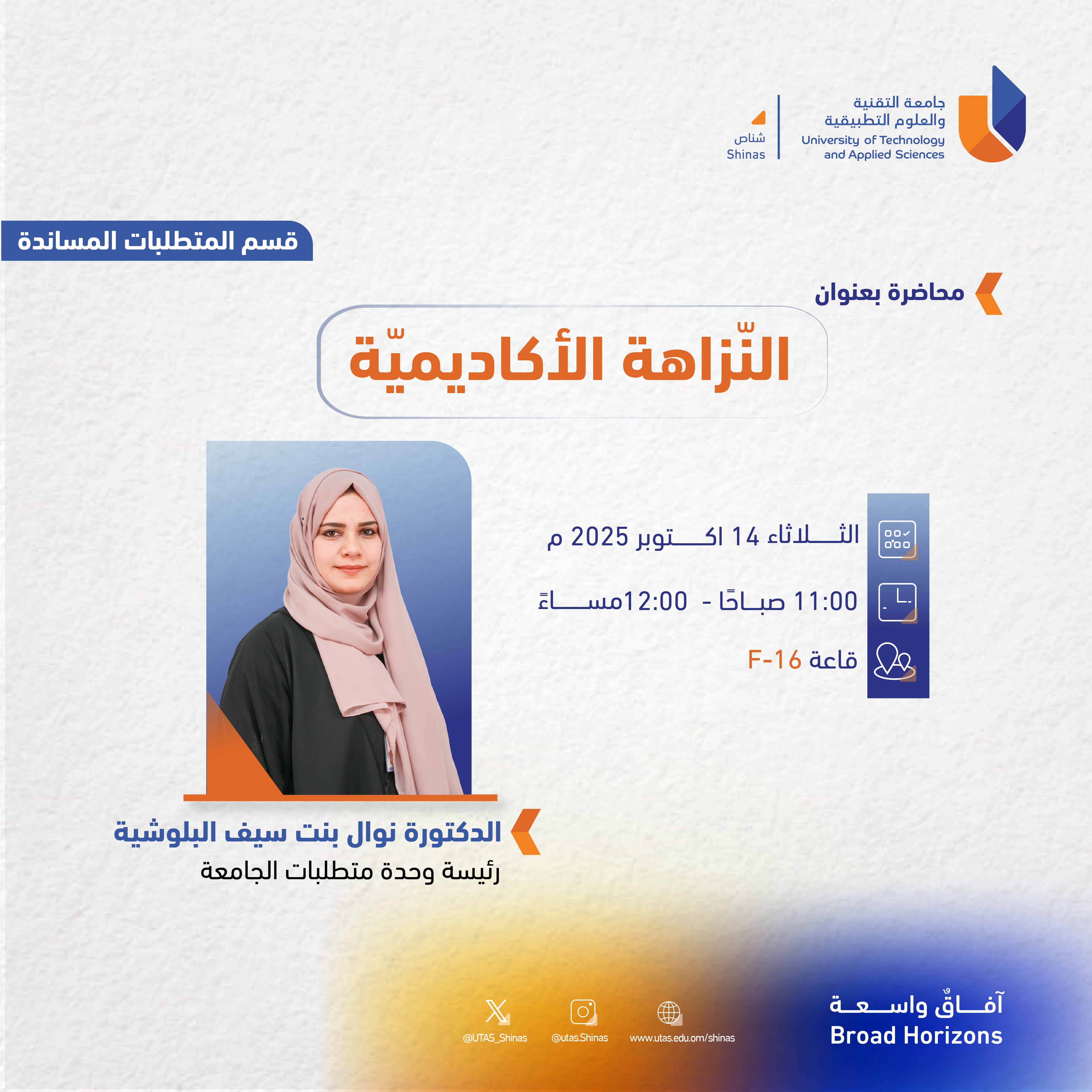 Sunday, October 12, 2025 / Categories: Announcements النزاهة الاكاديمية Previous Article قوة العادات الصغيرة، اتقان مهارات الدراسة Next Article Next Generation Careers: Navigating Jobs with Emerging Technologies Print 14 Rate this article: No rating