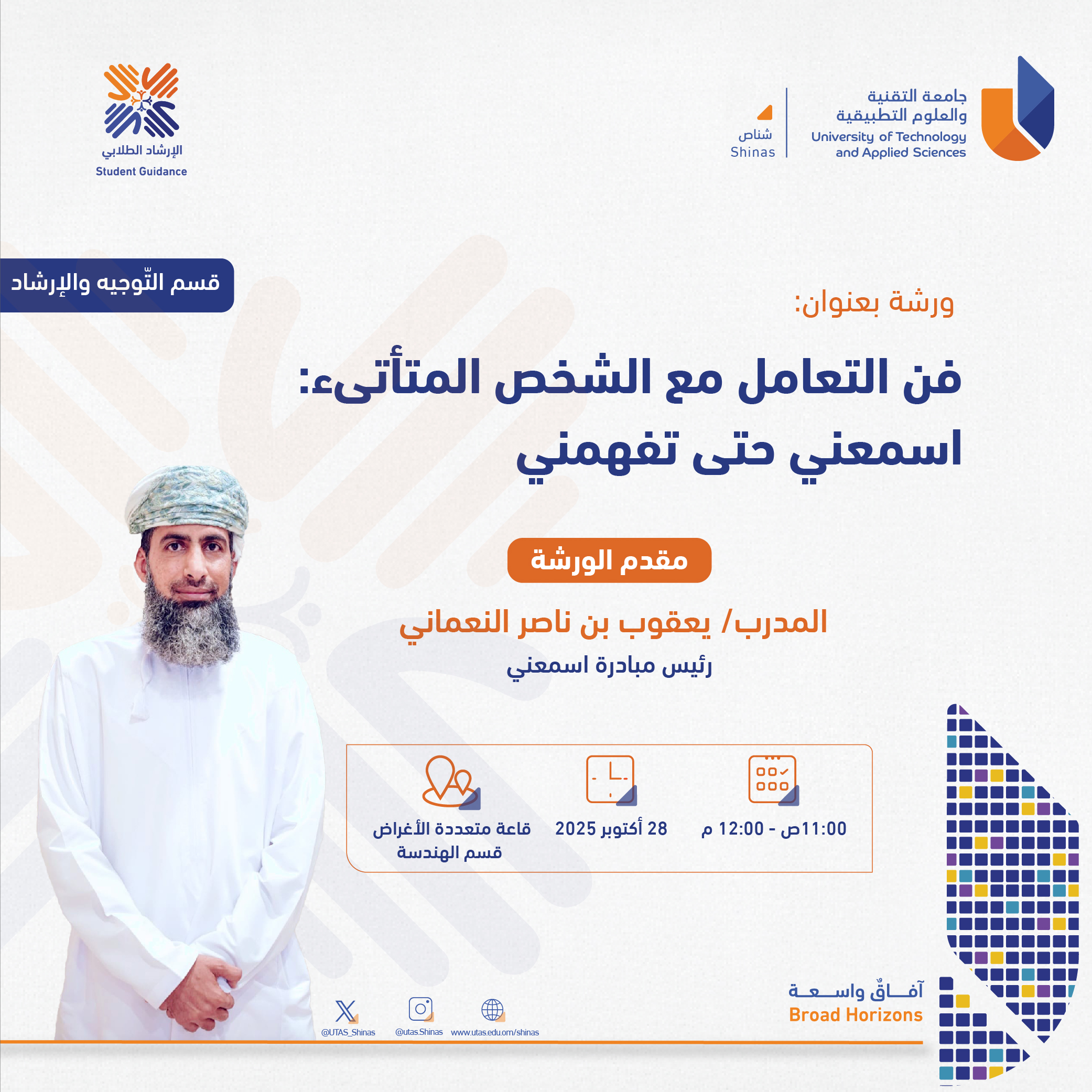 Thursday, October 23, 2025 / Categories: Announcements فن التعامل مع الشخص المتأتىء: اسمعني حتى تفهمني Previous Article تحليل البيانات بواسطة اكسل المتقدم وعرضها في رسومات بيانية Next Article التسجيل في برنامج مذيعي الربط وكلمة الخريجين لطلبة فرع شناص Print 3 Rate this article: No rating