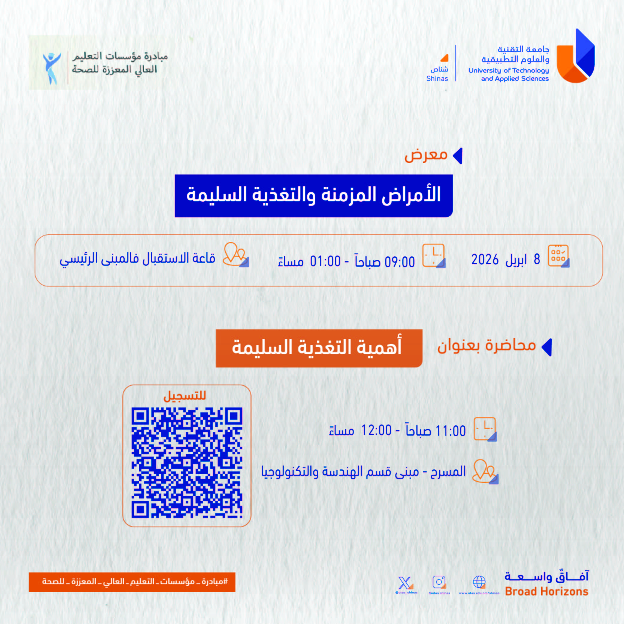 Monday, April 6, 2026 / Categories: Announcements معرض الأمراض المزمنة والتغذية السليمة Previous Article برنامج تطوير المهارات والاستعداد لسوق العمل Next Article الأسبوع التعليمي معهد مهندسي الكهرباء والإلكترونيات Print 21 Rate this article: No rating
