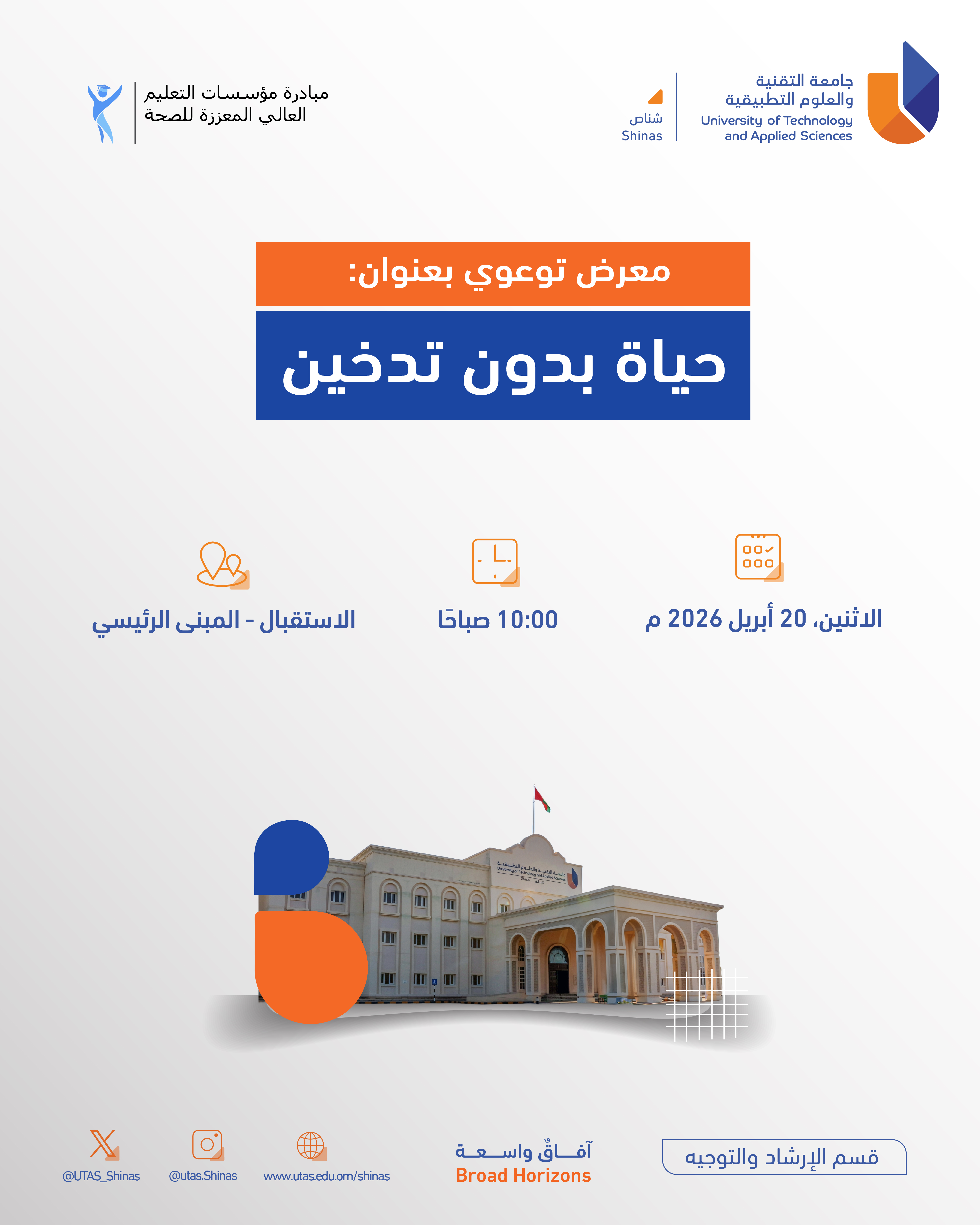 Thursday, April 16, 2026 / Categories: Announcements معرض توعوي بعنوان: حياة بدون تدخين Previous Article دقيقة وعي Print 5 Rate this article: No rating