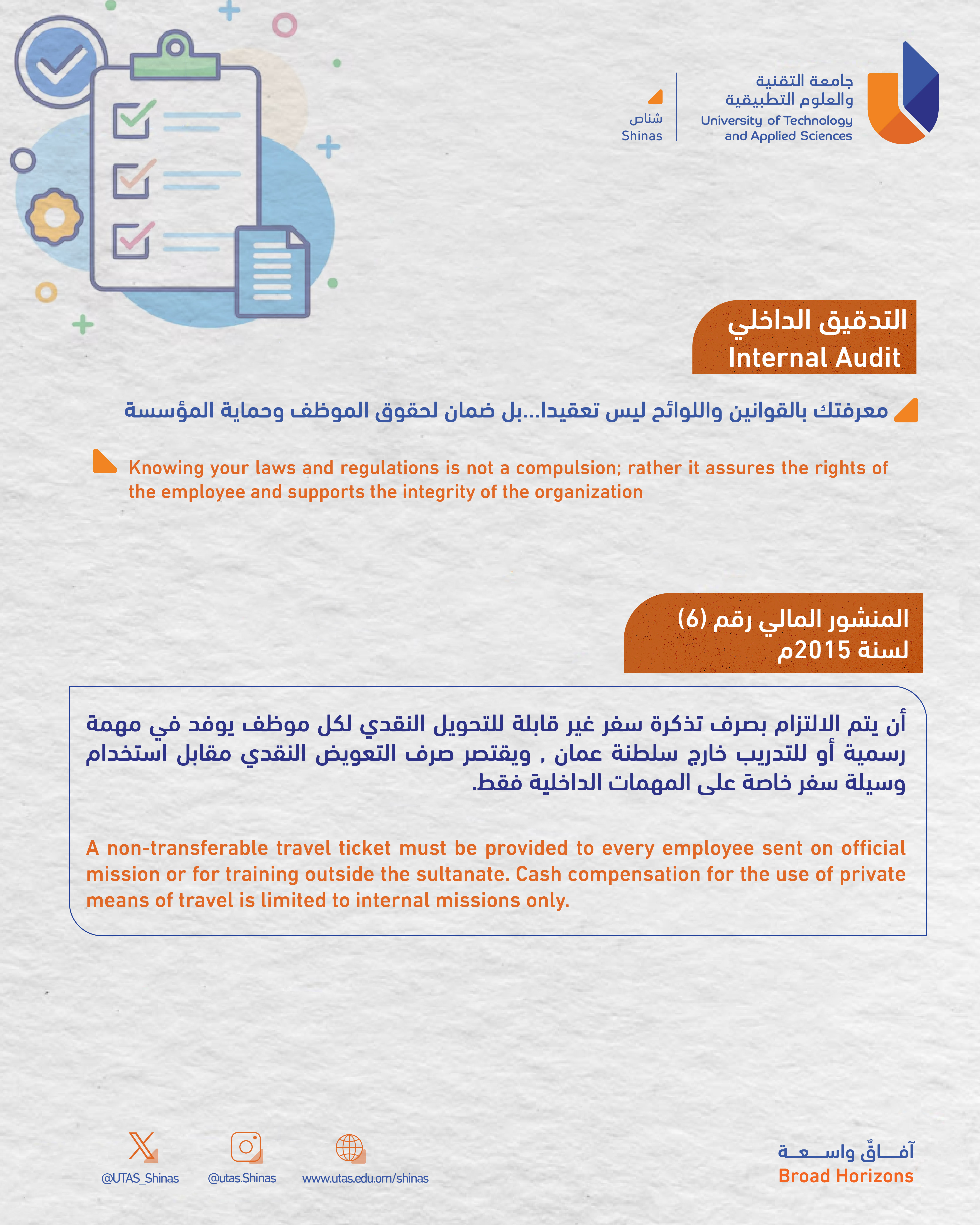 Sunday, April 19, 2026 / Categories: Announcements معرفتك بالقوانين واللوائح ليس تعقيدا...بل ضمان لحقوق الموظف وحماية المؤسسة Previous Article معرض توعوي بعنوان: حياة بدون تدخين Print 6 Rate this article: No rating